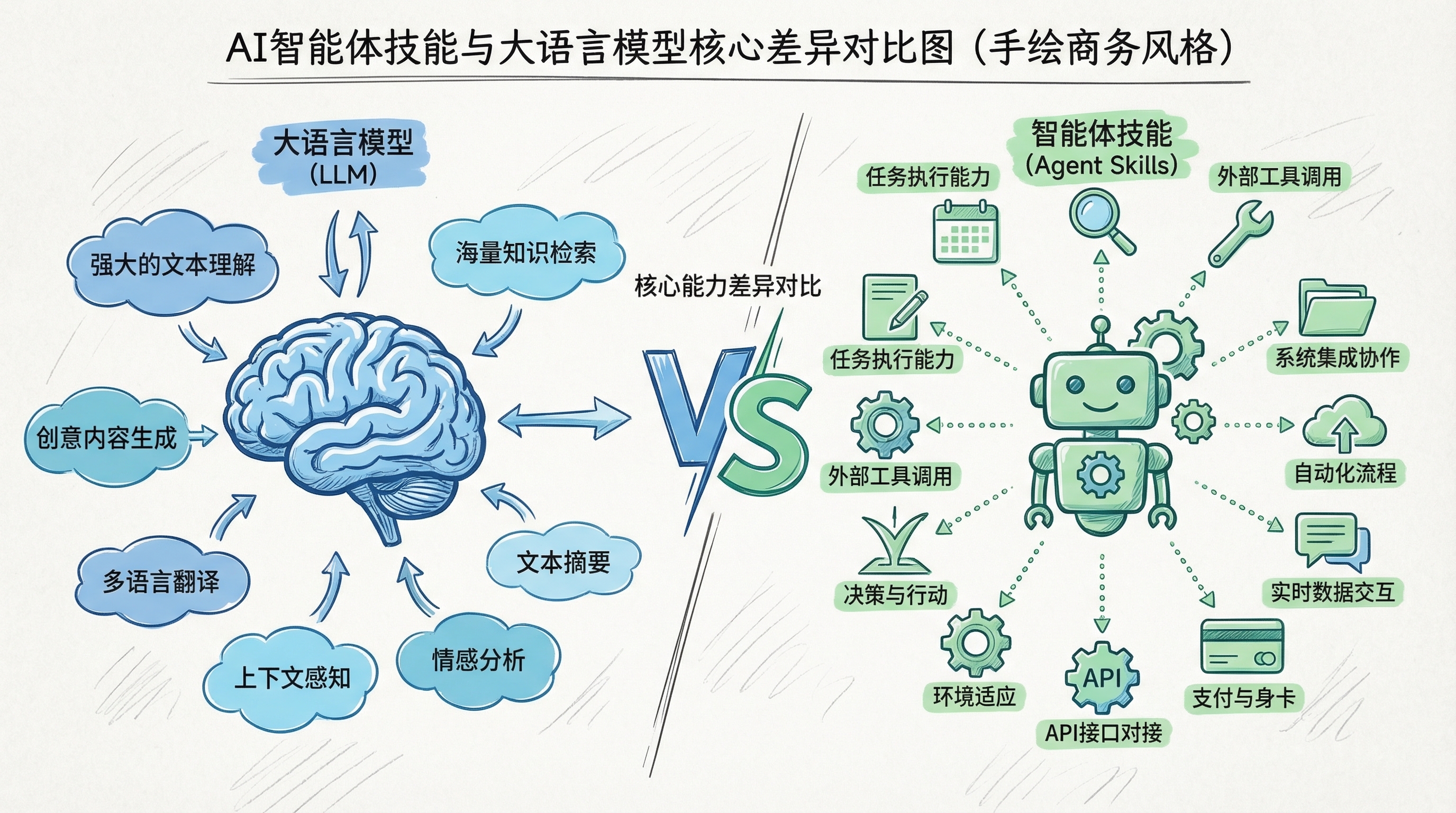 在AI技术快速演进的2026年,你是否也曾困惑过这样的问题:为什么有时候ChatGPT能够完美回答你的问题,但在处理复杂的业务流程时却显得力不从心?为什么企业在部署AI解决方案时,往往需要的不仅仅是一个"会聊天"的大模型?这背后的根本原因,正是Agent Skills(智能体技能)与LLM(大语言模型)之间存在着本质性的差异。理解这些差异,不仅能帮你选择正确的AI技术路径,更能让你在AI应用的浪潮中抓住真正的商业价值。