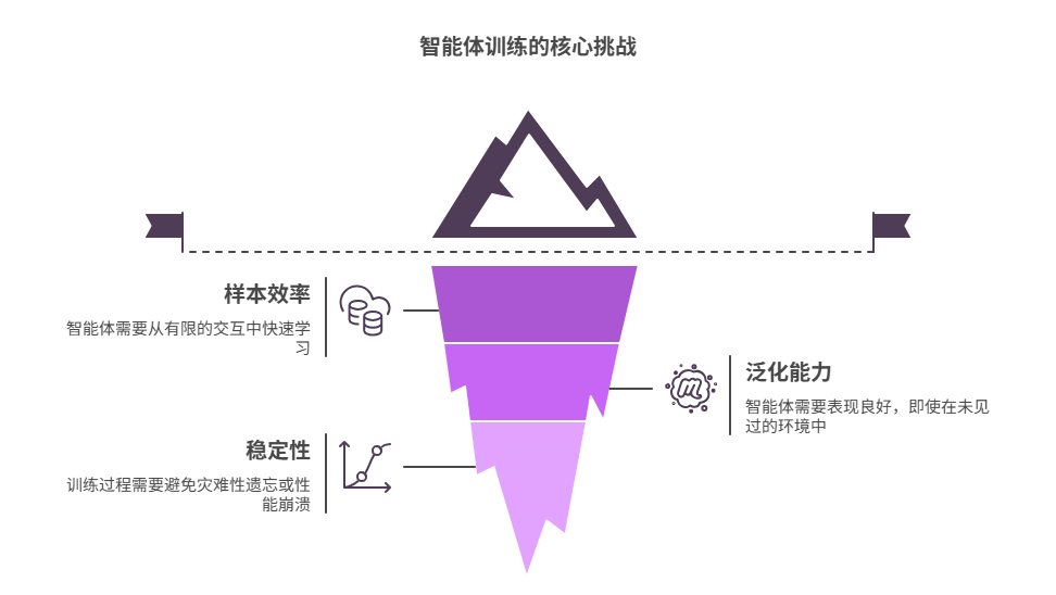 在实际应用中,智能体训练面临着三个核心挑战:样本效率、泛化能力和稳定性。
