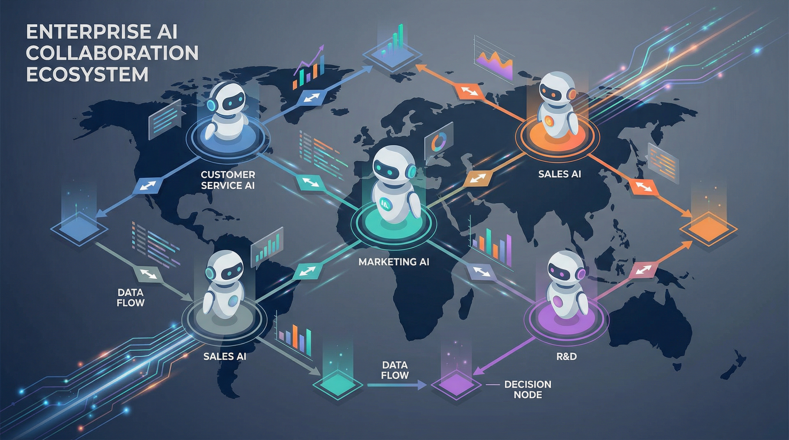 群体智能协同将重新定义AI Agent的工作模式。单个AI Agent的自主性虽然强大,但在处理复杂业务场景时仍然存在局限。未来的发展趋势是构建AI Agent生态系统,让多个专业化的Agent通过协同工作来解决复杂问题。这种协同不是简单的任务分工,而是真正的"集体智慧"——Agent之间能够共享知识、协调行动、互相学习。