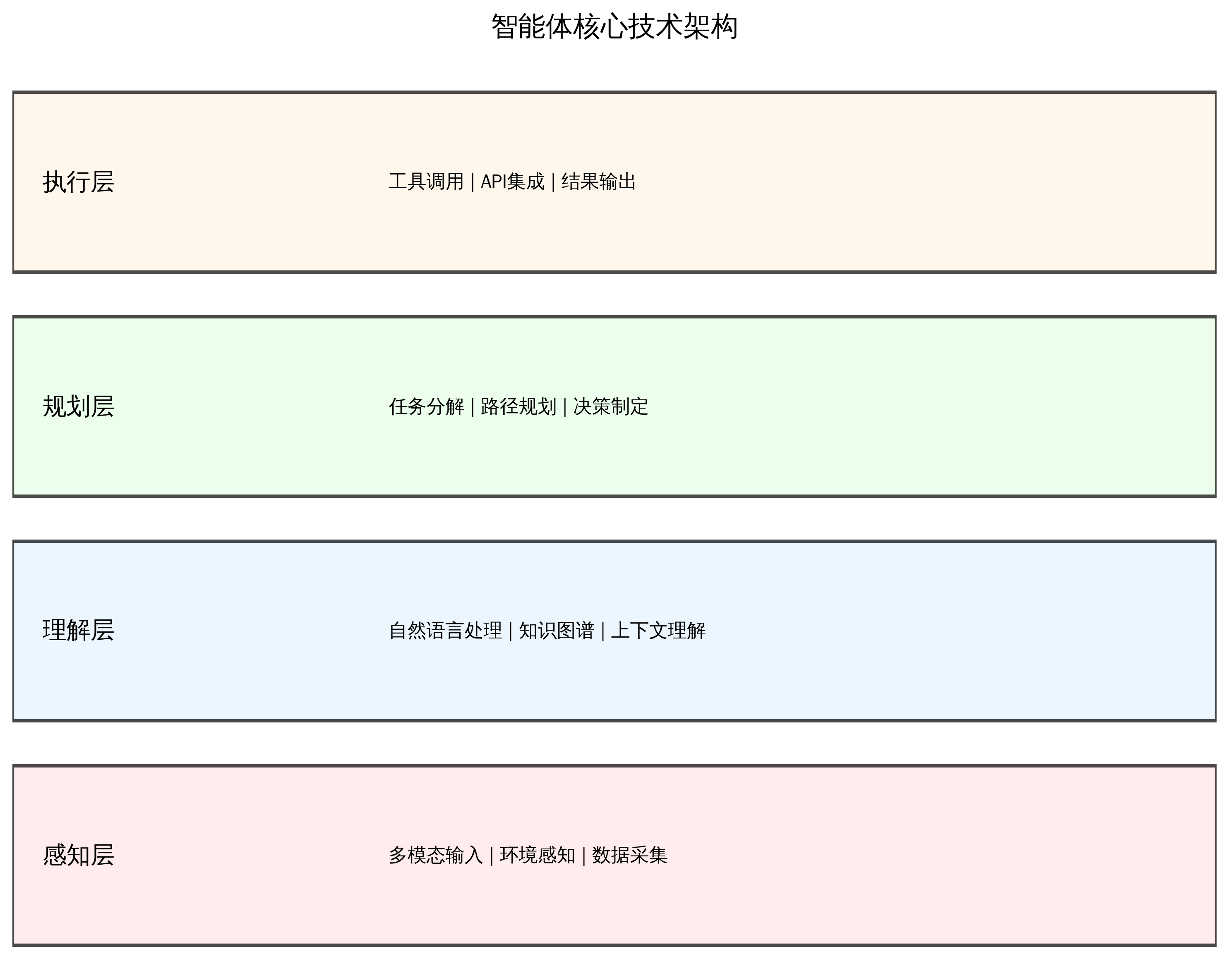 现代智能体系统采用分层架构设计,每一层都承担着特定的功能职责,确保整个系统的稳定性和可扩展性。