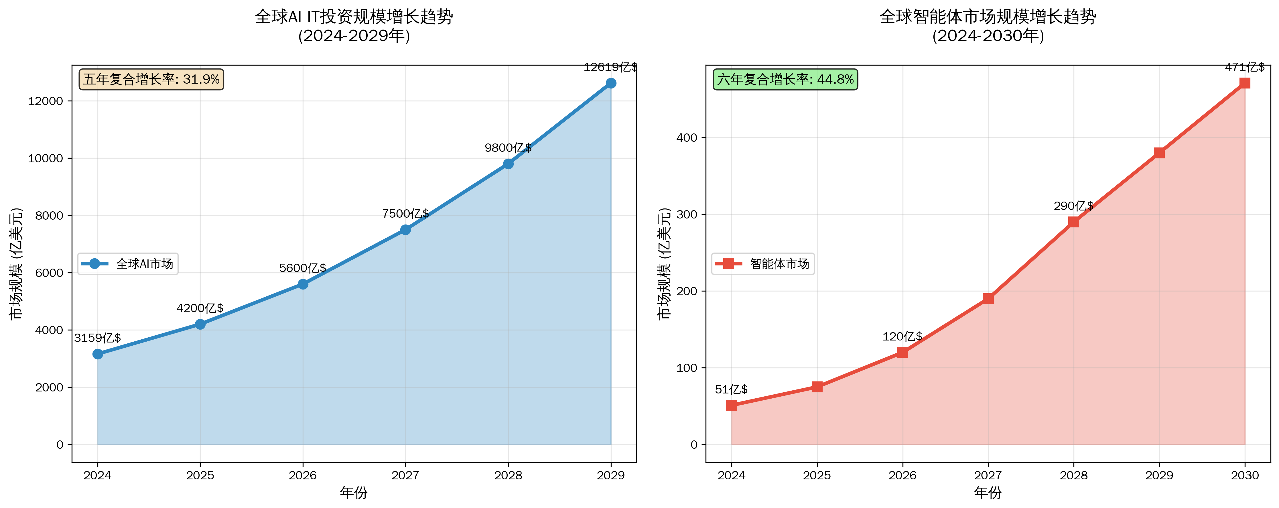 从上图可以看出,AI整体市场和智能体细分市场都呈现出强劲的增长态势。特别是智能体市场,其44.8%的年复合增长率远超传统IT领域,成为推动AI产业发展的重要引擎。