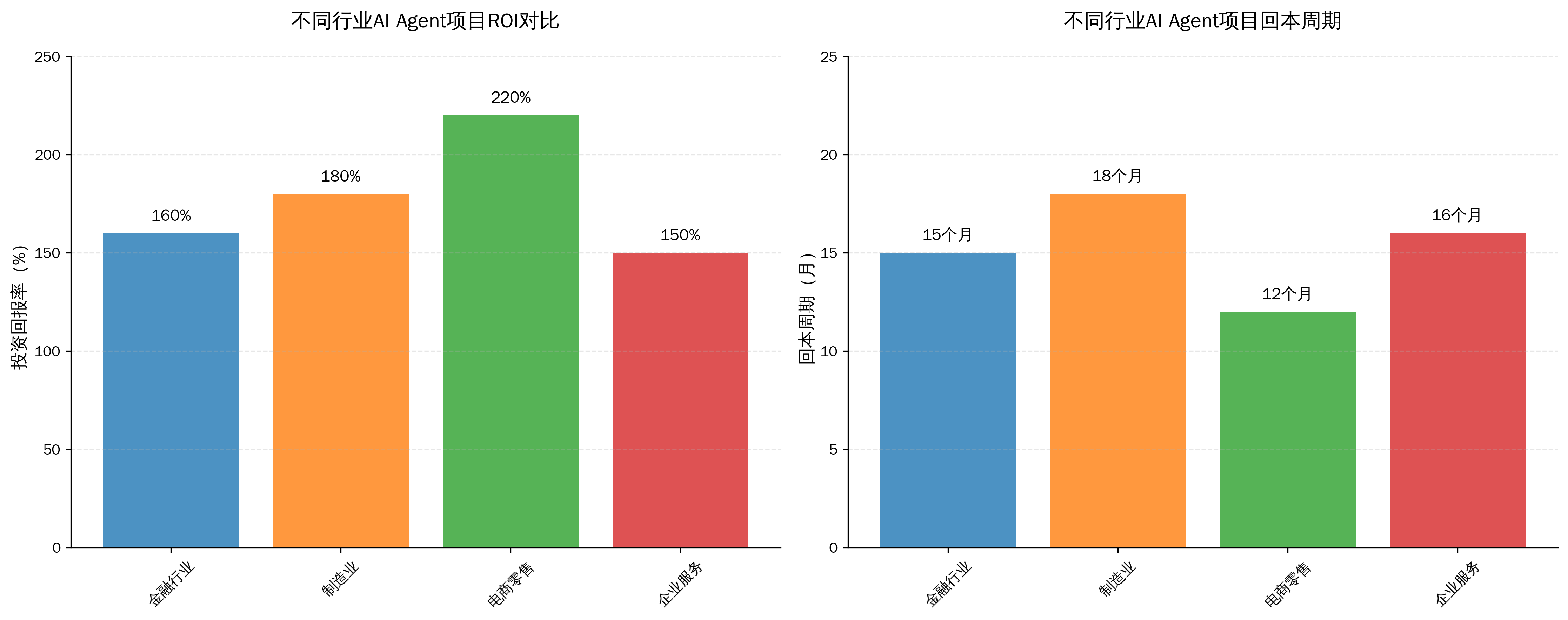 基于案例分析,AI Agent项目的投资回报周期通常为12-18个月,ROI普遍在150%-220%之间。电商零售行业的投资回报率最高,制造业虽然回本周期较长但ROI同样可观。