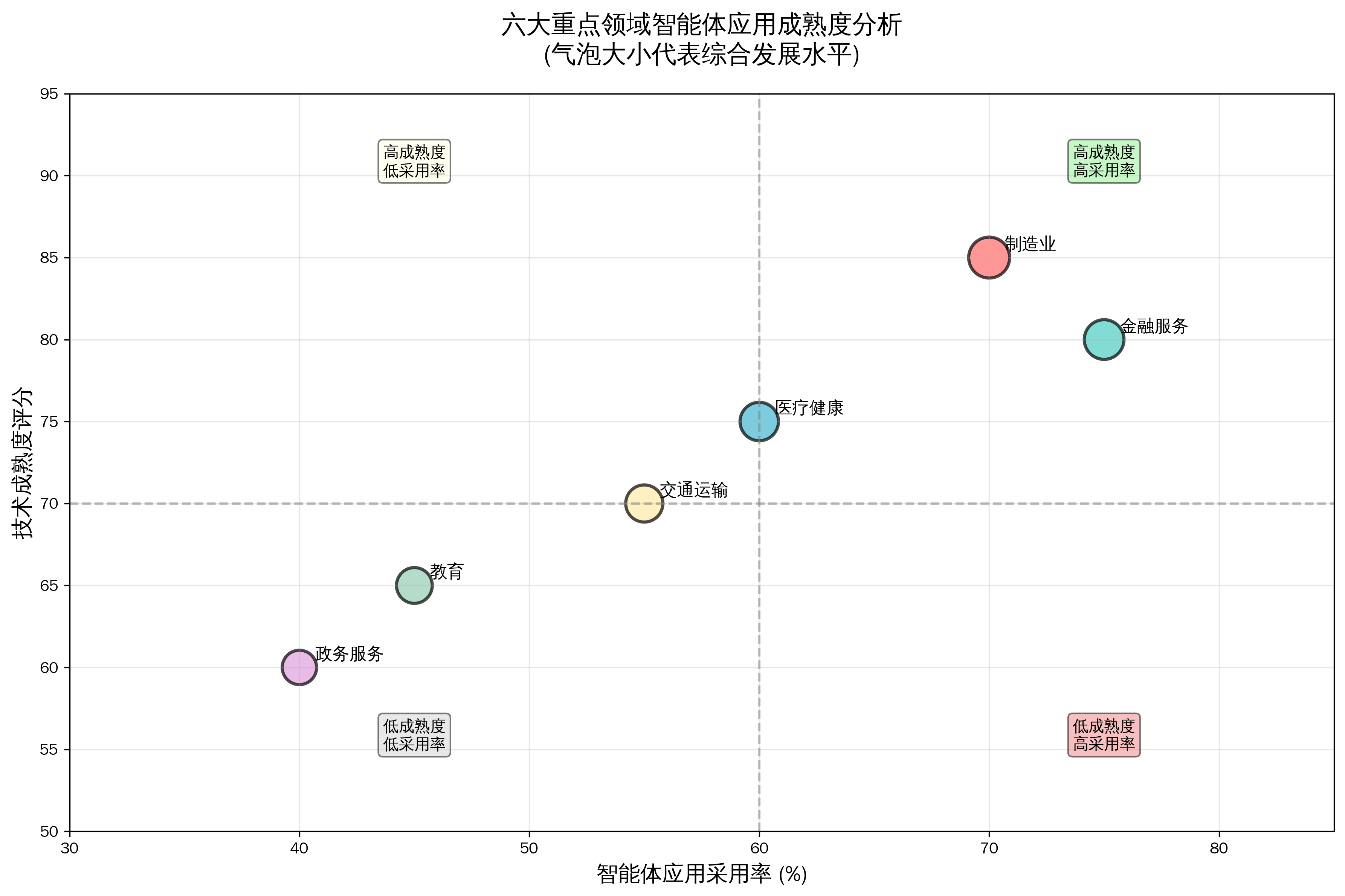 从上图可以看出,制造业和金融服务在智能体应用方面表现最为突出,既有较高的技术成熟度,也有较高的市场采用率。医疗健康领域虽然技术成熟度较高,但由于行业特殊性,采用率相对较低。教育、交通和政务服务领域仍有较大的发展空间。