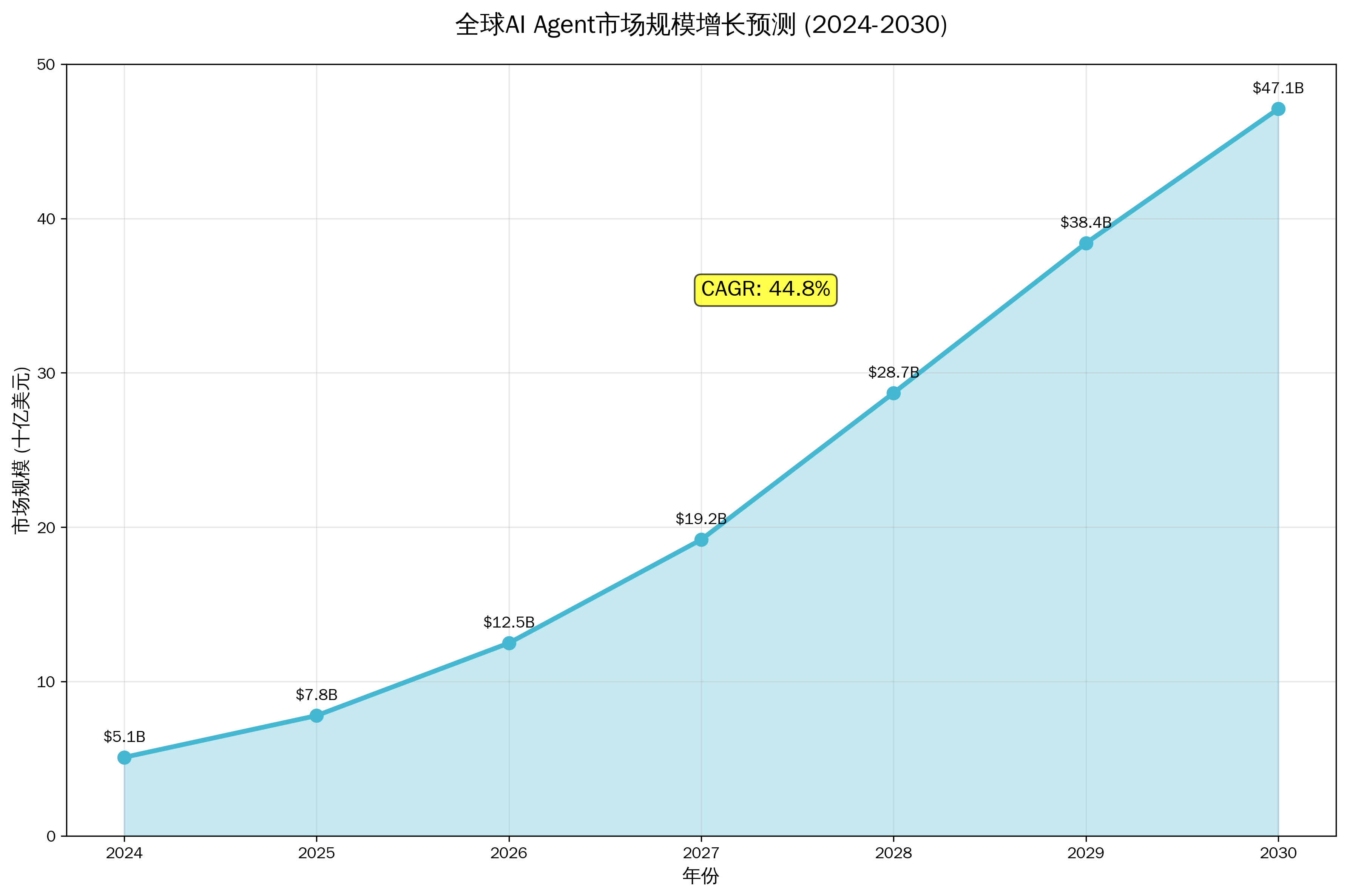 AI Agent Framework市场正经历爆发式增长。根据权威市场研究,全球AI Agent市场规模预计将从2024年的51亿美元增长到2030年的471亿美元,年复合增长率高达44.8%。