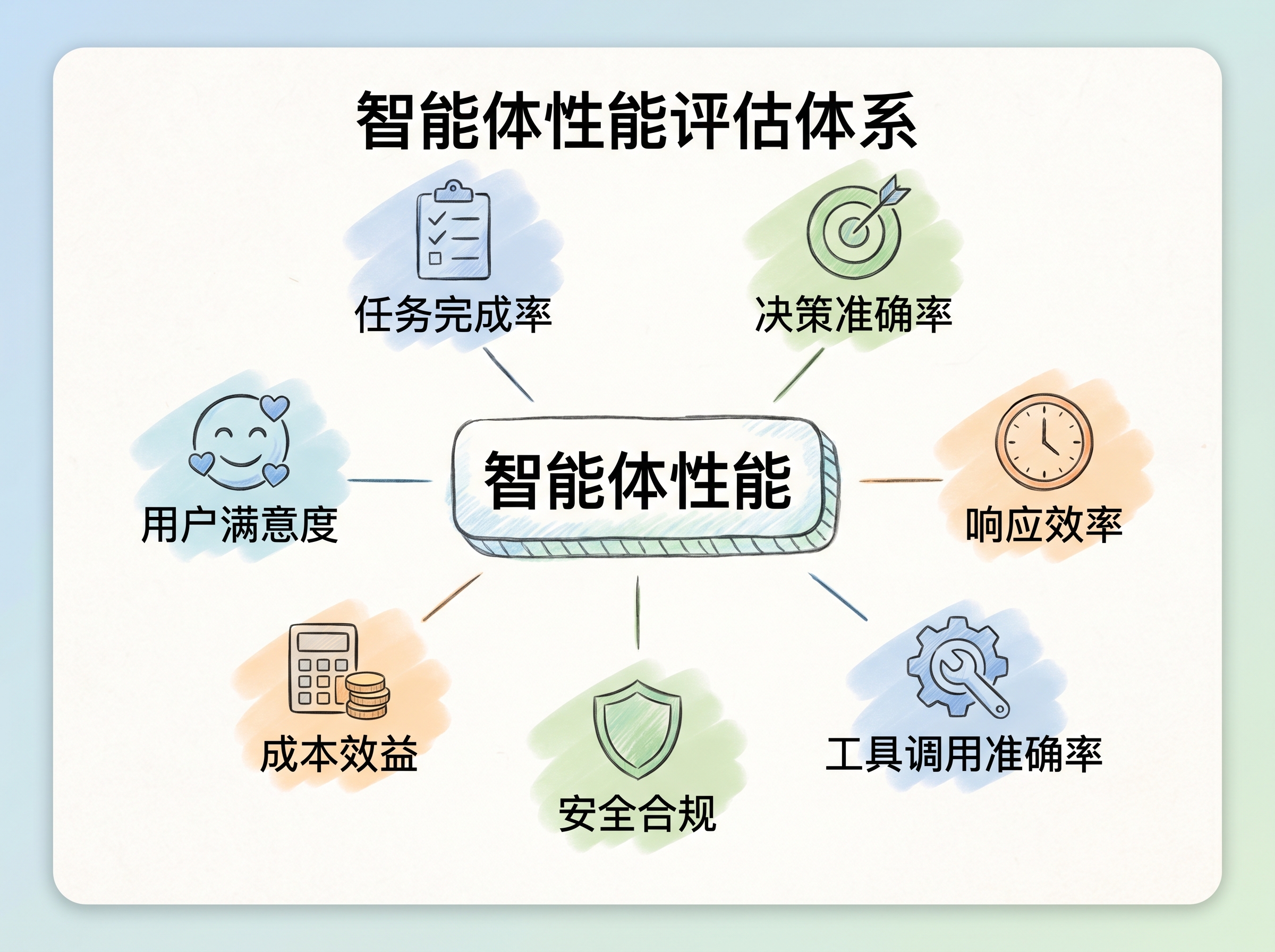 传统QPS(每秒查询数)等指标在智能体场景中同样面临失效的问题。一个智能体处理一个复杂研究任务,可能需要多次工具调用、多轮推理,耗时数分钟,这与传统接口的毫秒级响应完全不在同一量级。因此,评估智能体性能,需要一套专为其自主性、多步性和不确定性设计的指标框架。