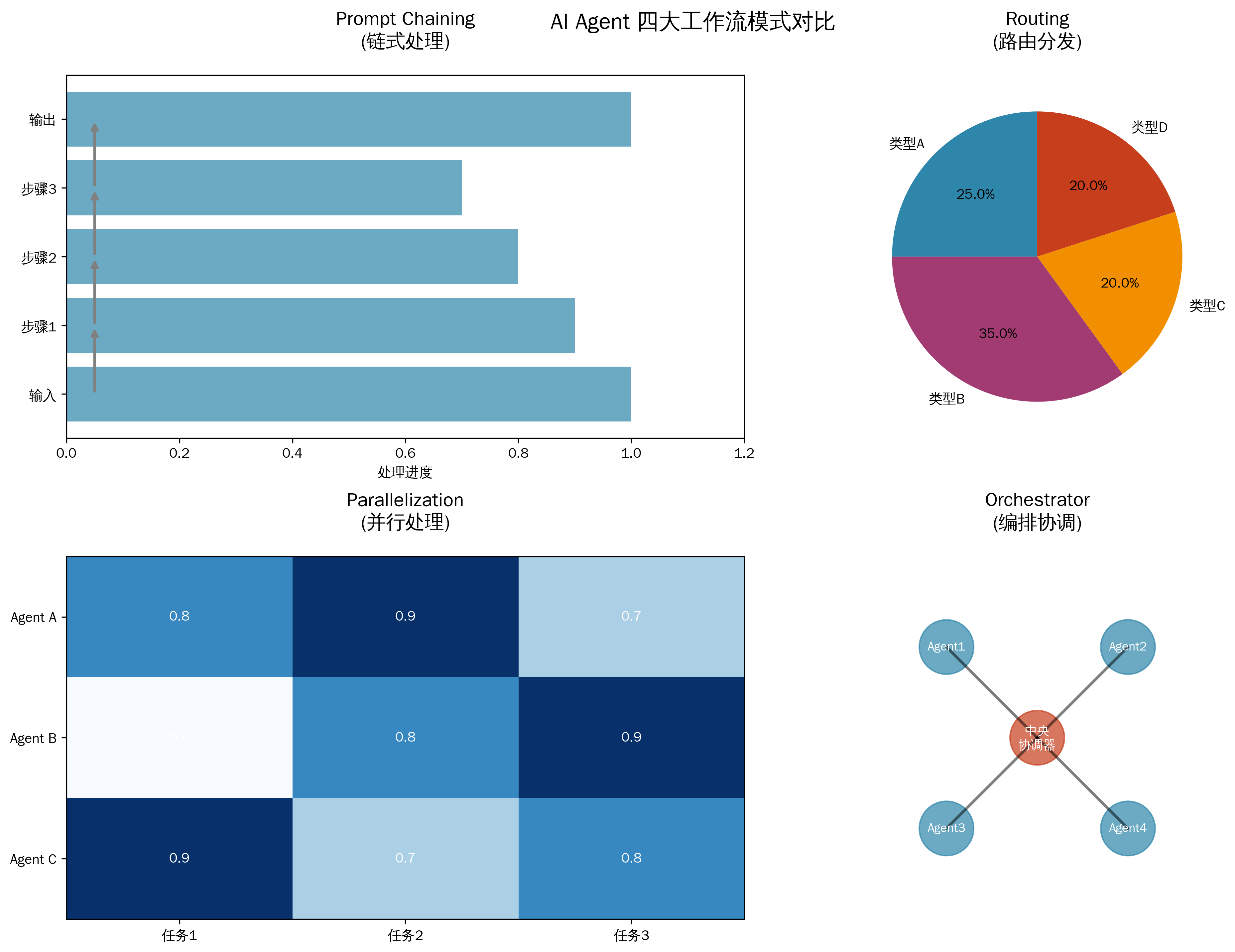 基于Anthropic的最新研究和众多企业的实践经验,当前主流的AI Agent工作流程可以归纳为四种核心模式。每种模式都有其独特的适用场景和技术特点。