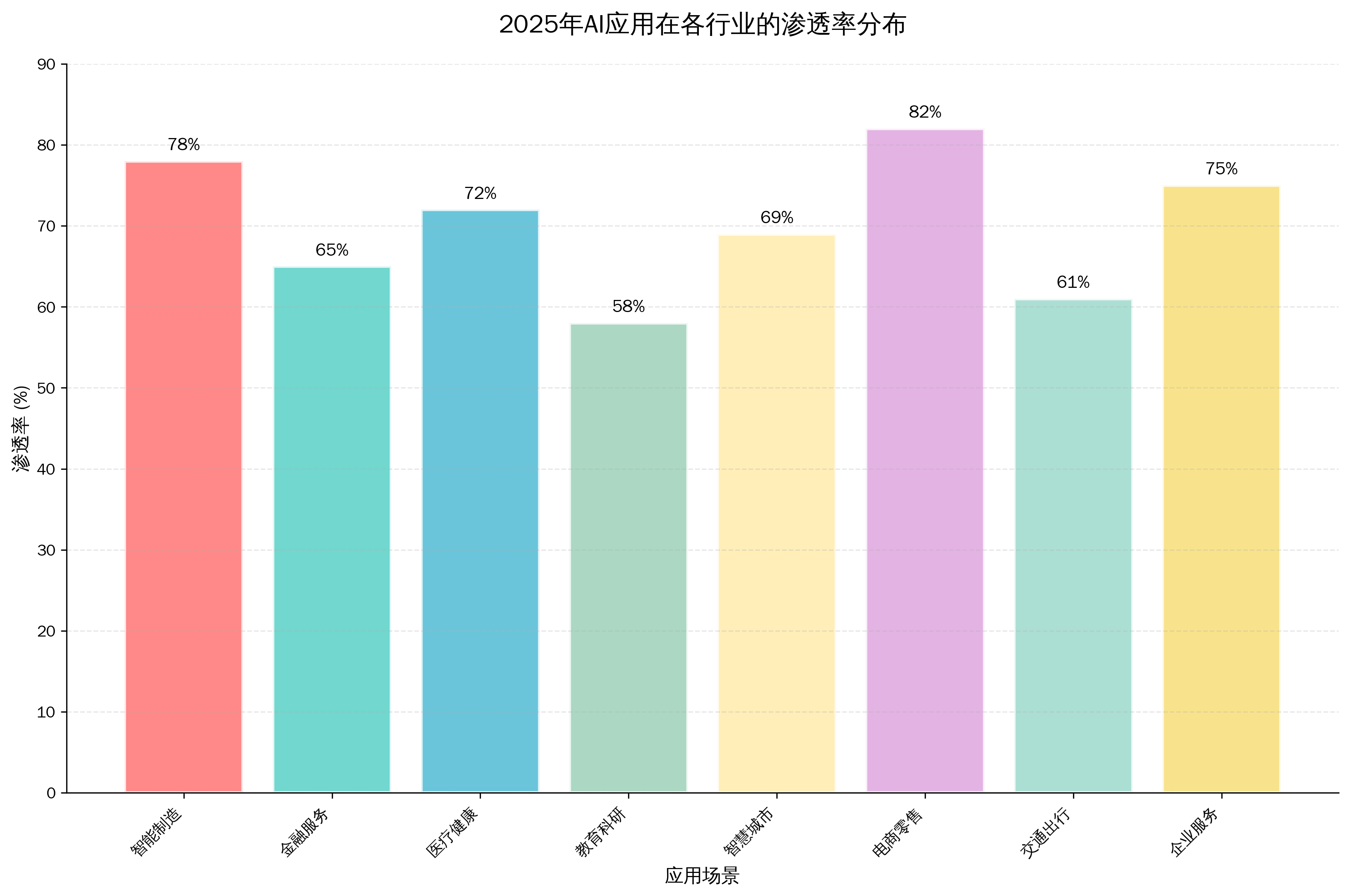 从各行业的AI渗透率数据可以看出,电商零售、智能制造和企业服务等领域的AI应用相对成熟,而教育科研、交通出行等领域仍有较大发展空间。