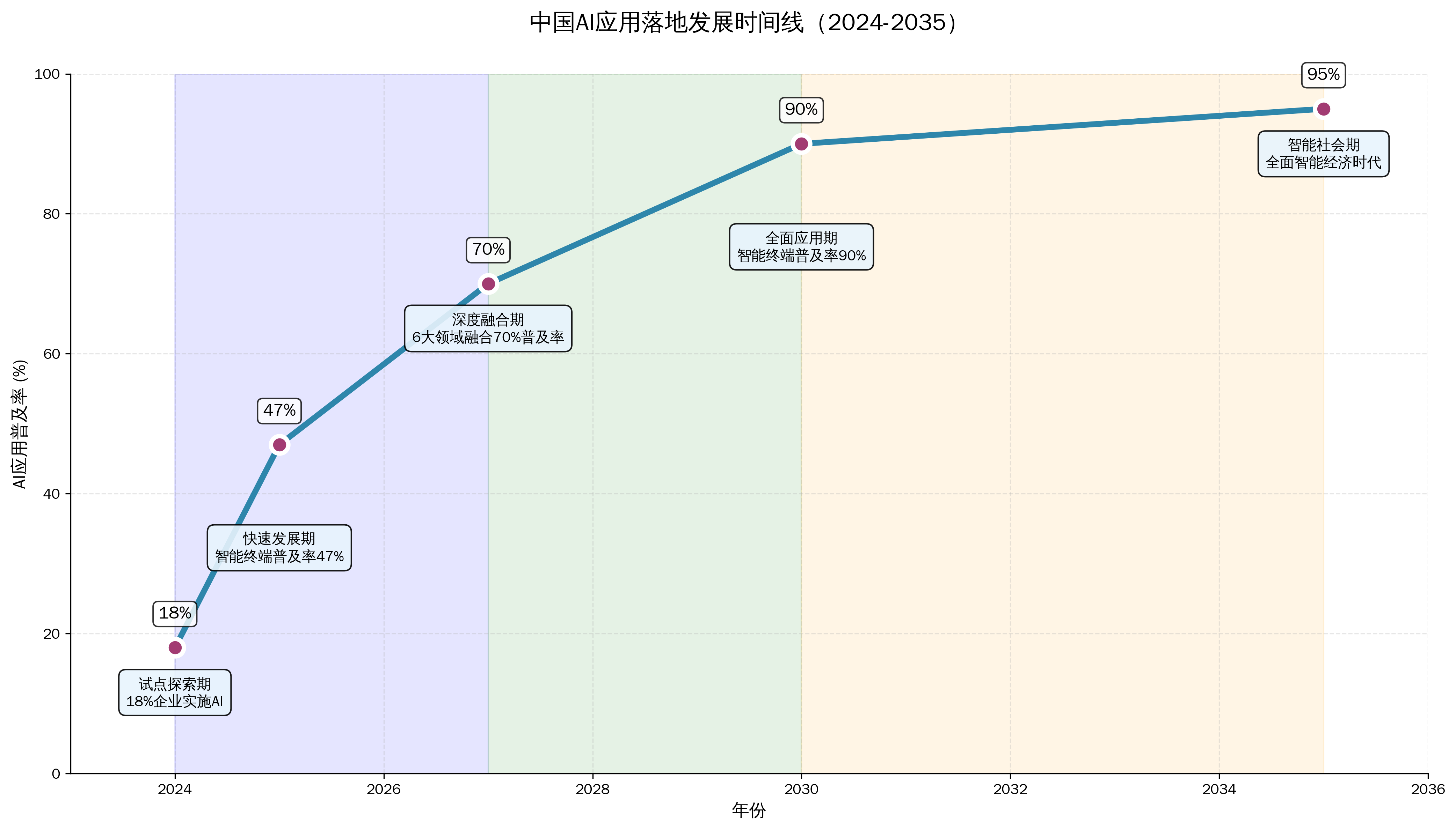 从时间线可以看出,我们正处于AI应用的关键转折点。2025年将是企业从试点探索向规模部署转变的重要节点,智能终端普及率预计将达到47%,为后续的深度融合奠定基础。