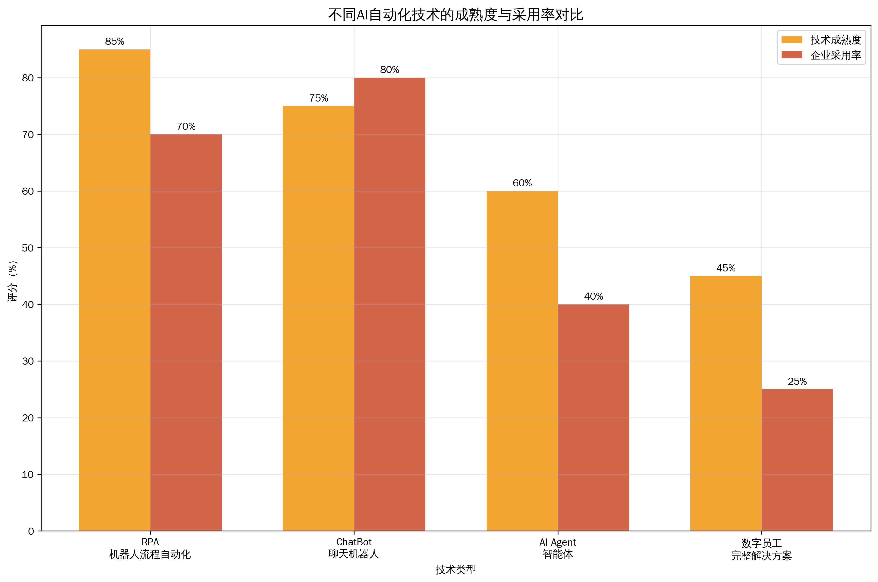 当前市场上的AI自动化技术呈现明显的成熟度差异。传统RPA机器人流程自动化技术相对成熟,企业采用率达到70%,但局限于结构化、规则明确的场景。而基于大模型的AI智能体技术虽然潜力巨大,但成熟度仅为60%,企业采用率也相对较低。