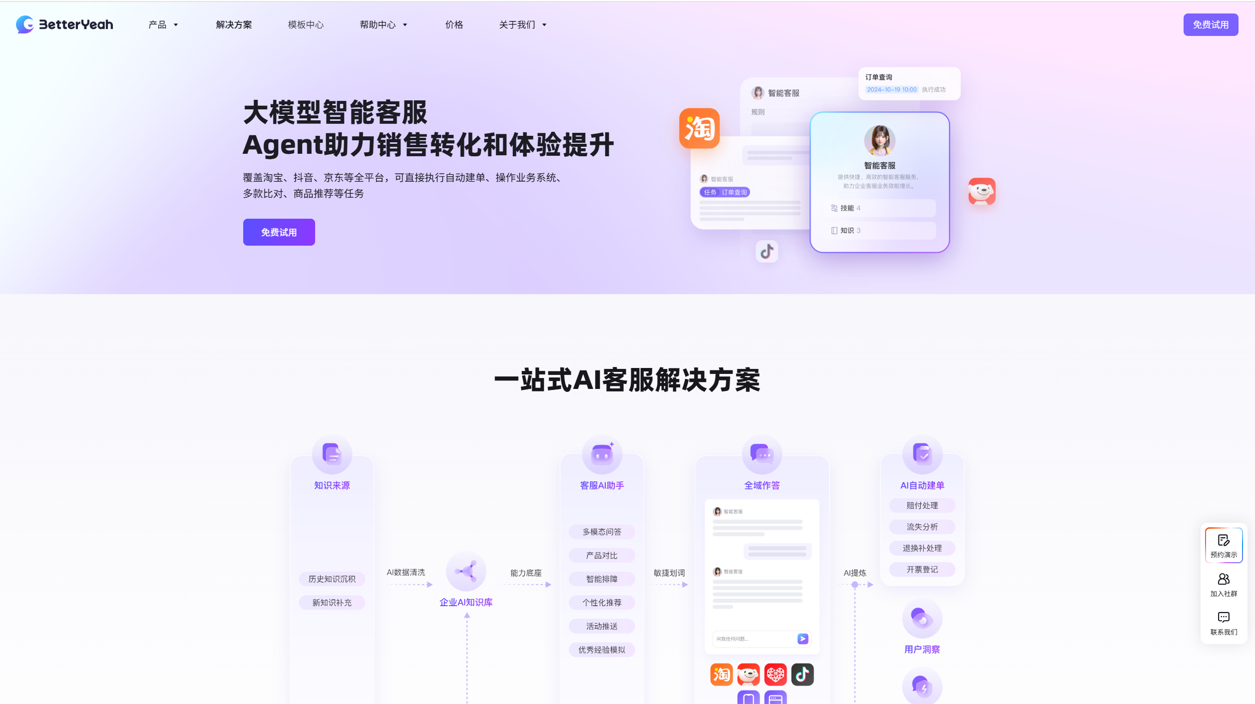 BetterYeah AI智能客服Agent基于其企业级AI Agent平台打造,主打快上线、深集成、易调优、全保障四大核心优势。