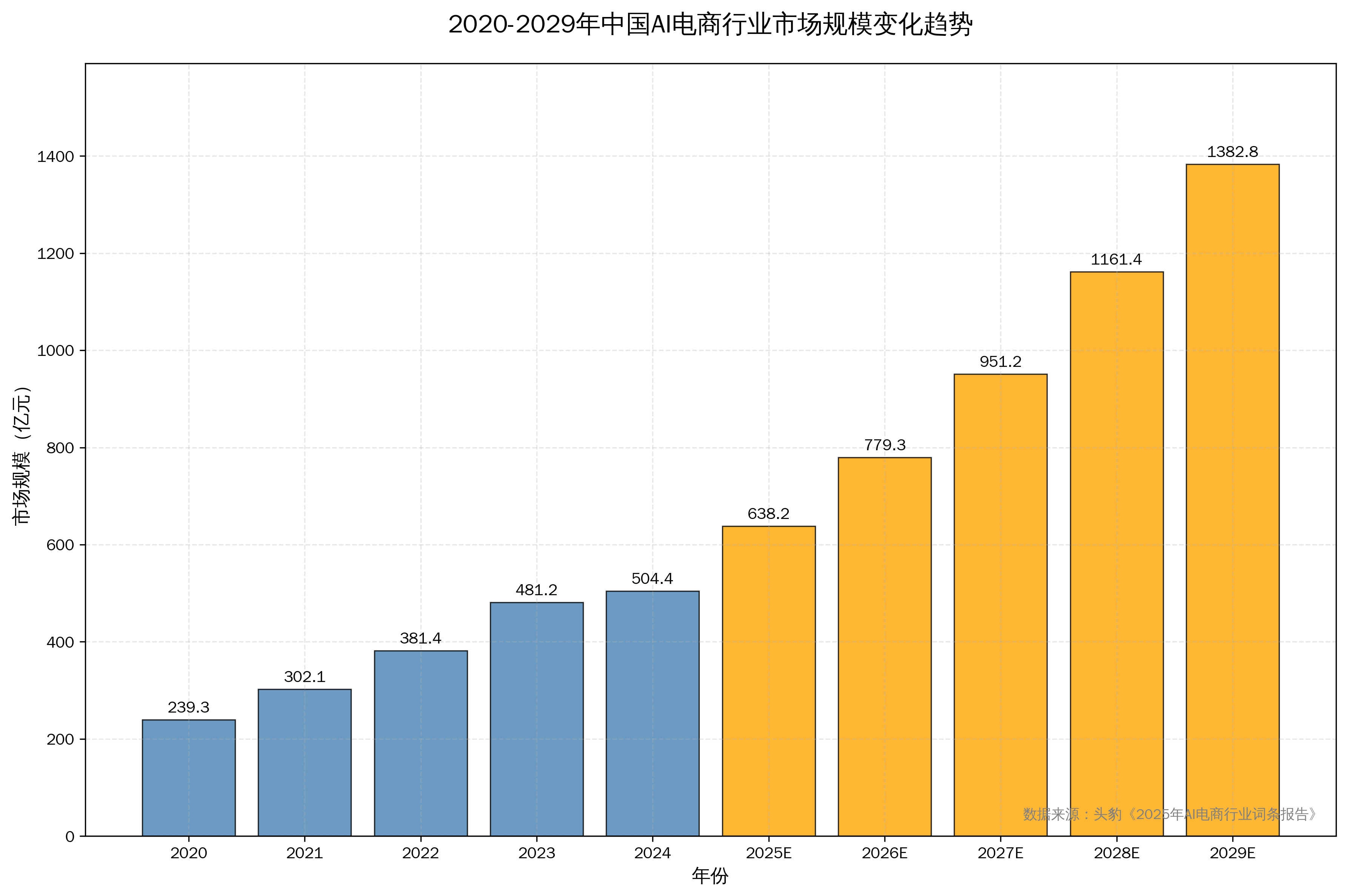 根据头豹发布的《2025年AI电商行业词条报告》数据显示,中国AI电商行业正处于高速发展阶段。2020年至2024年,AI电商行业市场规模从239.27亿元增长至504.45亿元,年复合增长率达20.50%。预计2025年至2029年,市场规模将从638.24亿元增长至1,382.81亿元,年复合增长率预期达21.32%。