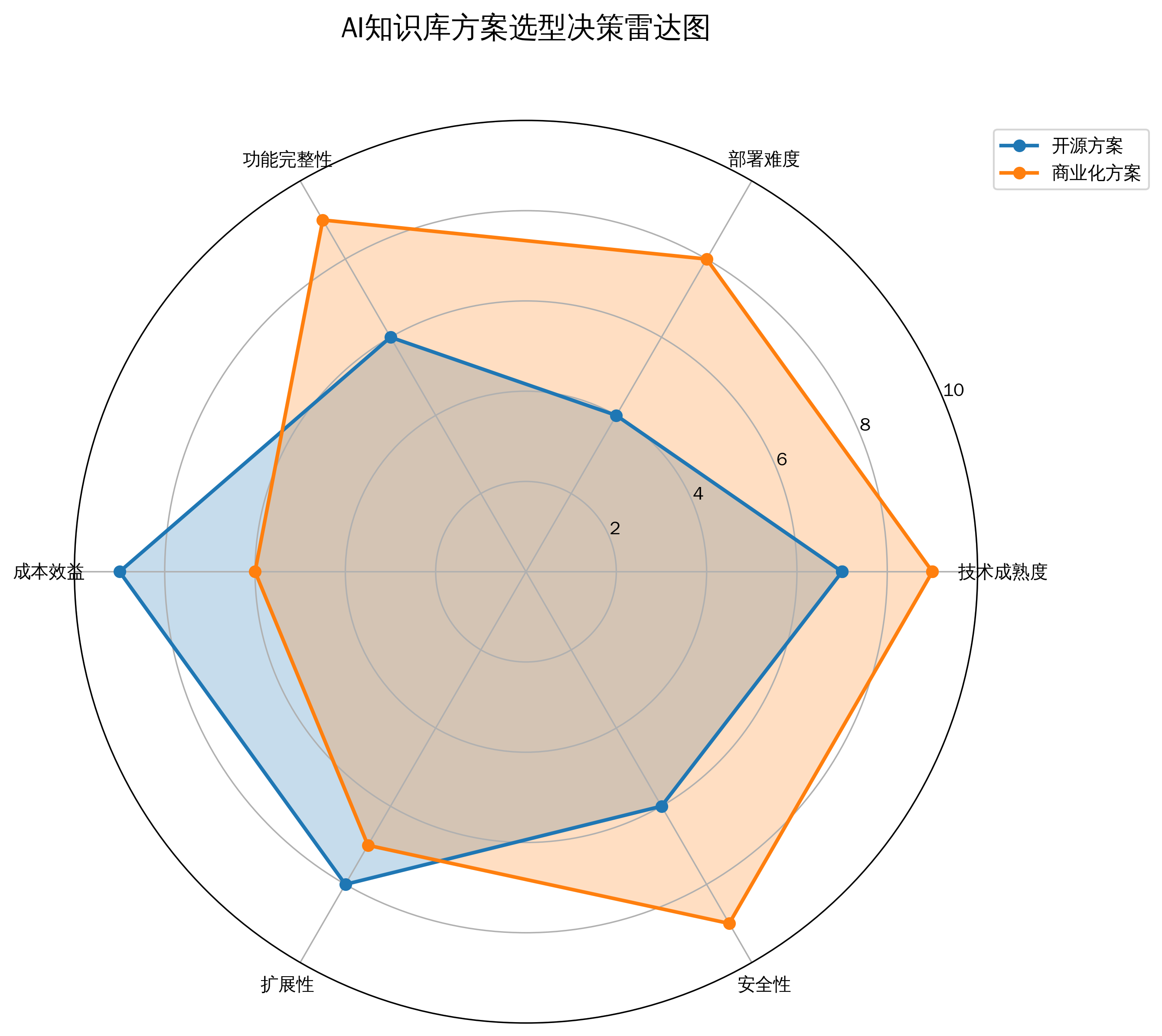 从雷达图可以看出,开源方案在成本效益和扩展性方面具有明显优势,而商业化方案在技术成熟度、功能完整性和安全性方面表现更佳。企业应根据自身的技术实力、预算约束和安全要求进行综合权衡。