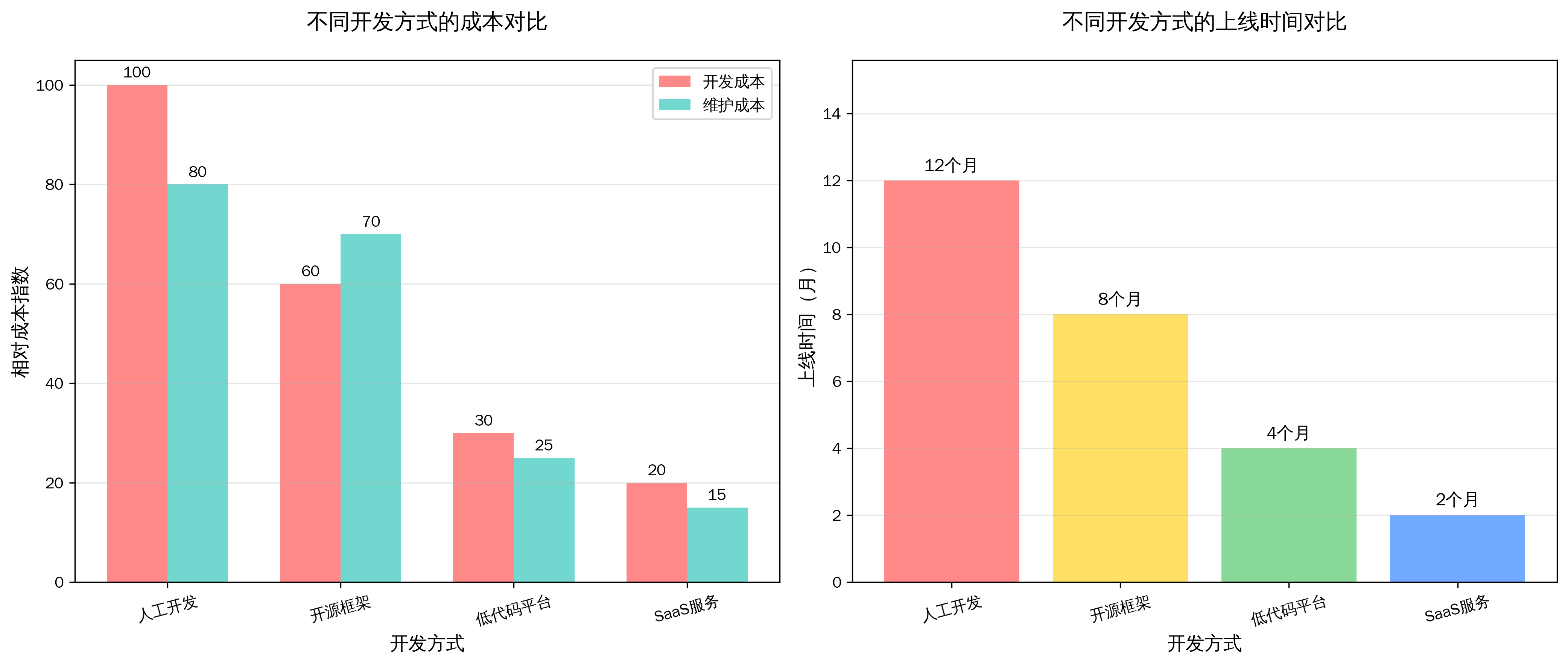 从成本分析图可以看出,低代码平台和SaaS服务在开发成本和上线时间方面具有明显优势,这也是当前企业级AI应用开发的主要趋势。