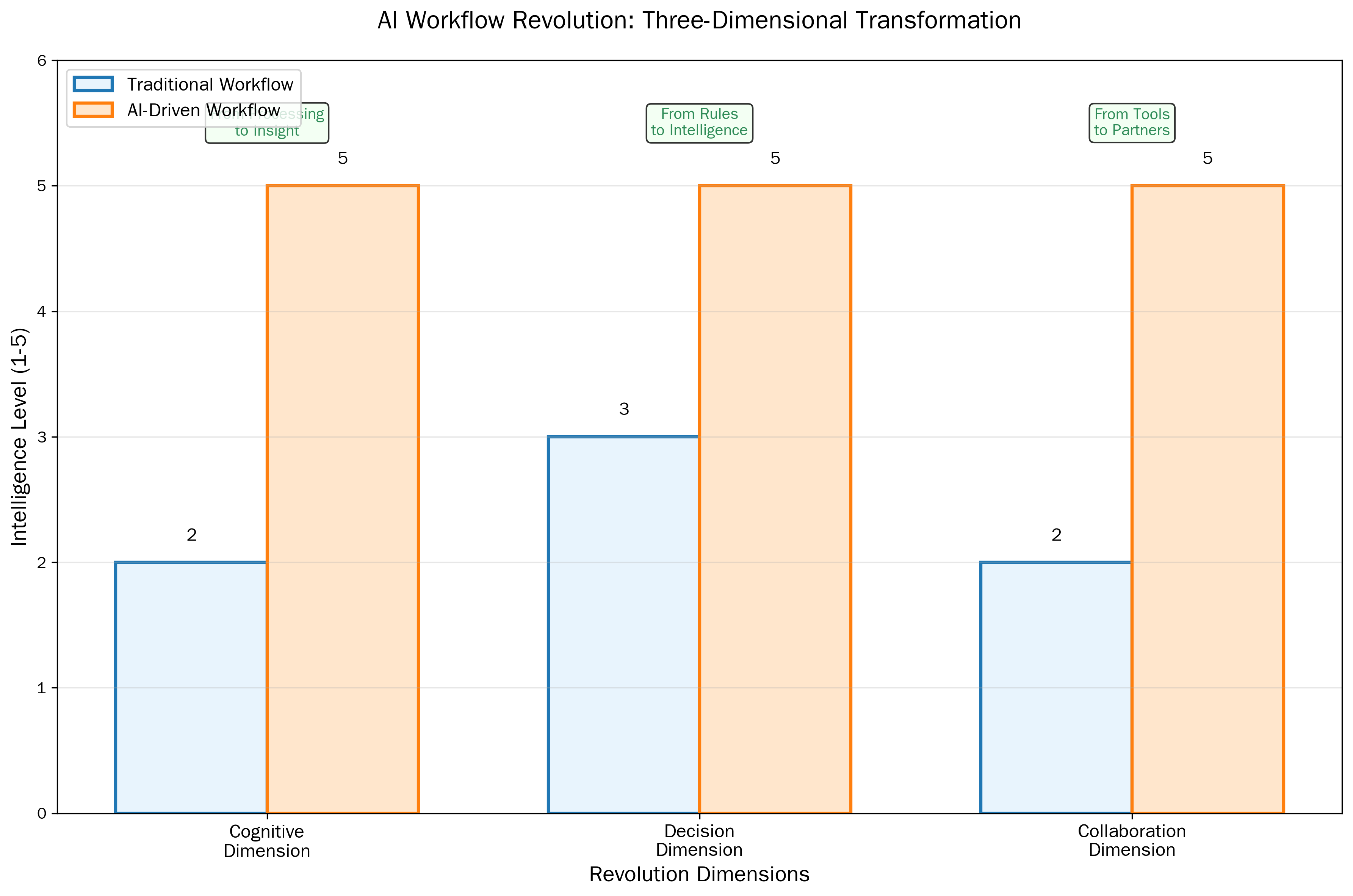 传统工作流革命往往聚焦于效率提升,而AI驱动的工作流革命则在三个根本维度上重新定义了工作本身。
