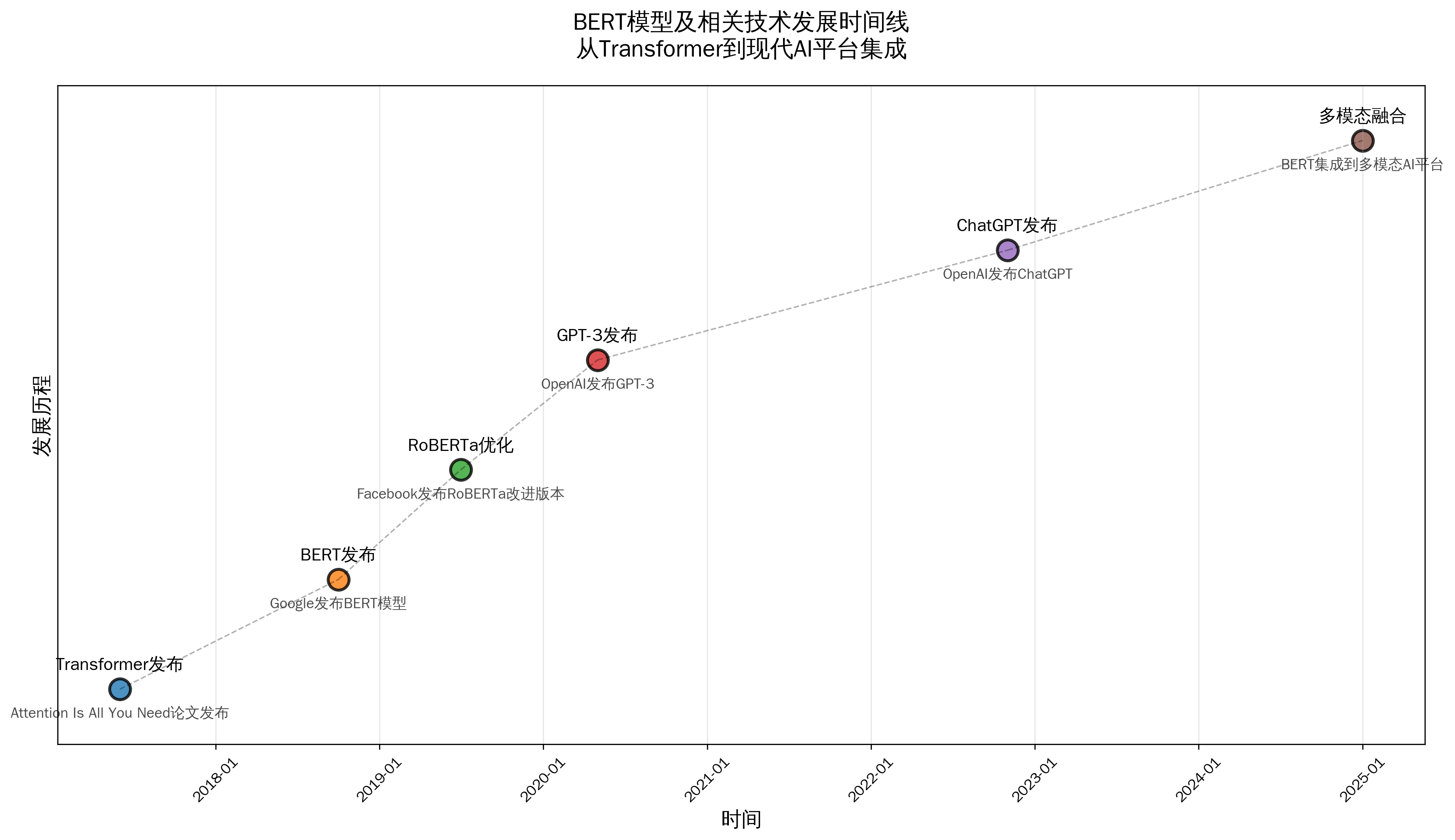 当前的大语言模型发展呈现出明显的规模化和多模态化趋势,但BERT的技术DNA依然清晰可见。现代模型如BERT的后续版本RoBERTa、DeBERTa等,都在BERT的基础上进行了针对性优化,证明了其架构设计的前瞻性。