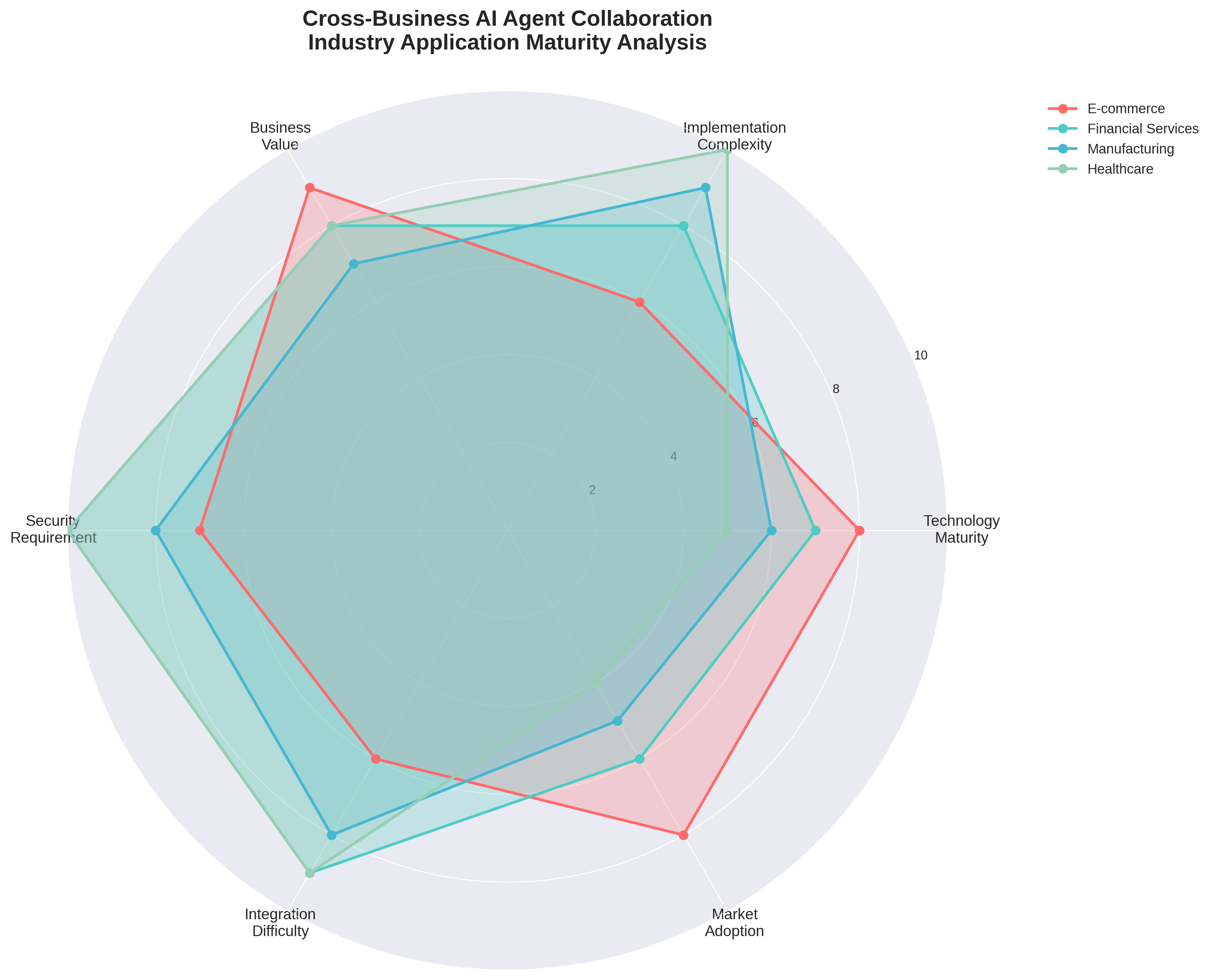 不同行业对跨业务智能体协同的应用成熟度存在显著差异。通过对技术成熟度、实施复杂度、业务价值、安全要求、集成难度和市场采用等维度的综合分析,我们可以更清晰地了解各行业的发展现状: