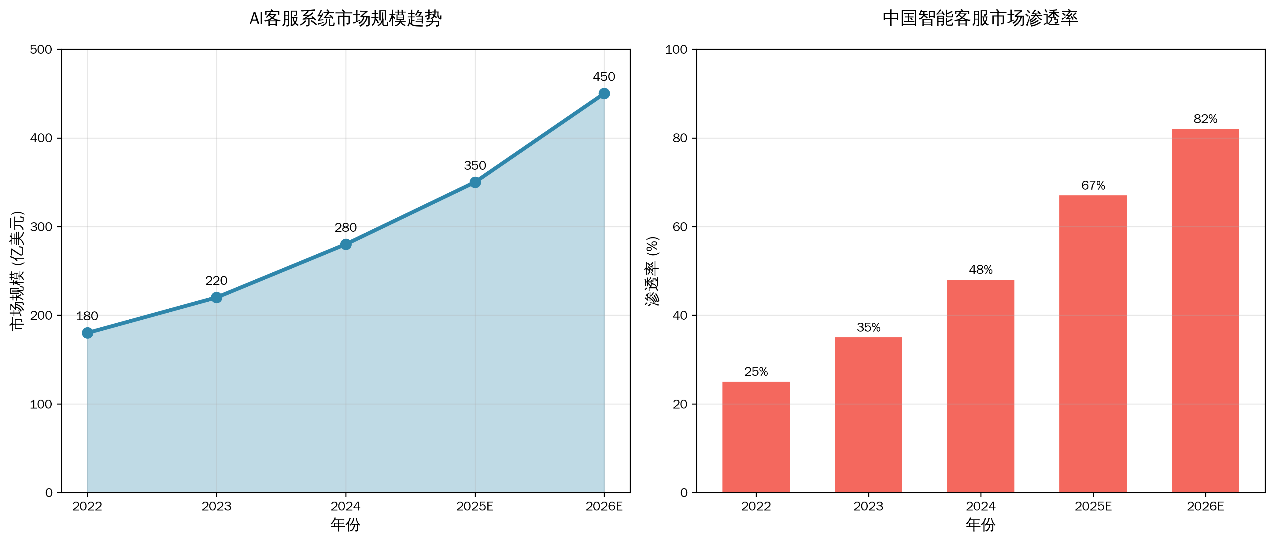 从上图可以清晰看出,智能客服系统市场规模呈现强劲增长态势,预计到2026年将达到450亿美元。同时,中国市场的渗透率也在快速提升,预计2025年将突破67%的关键节点。