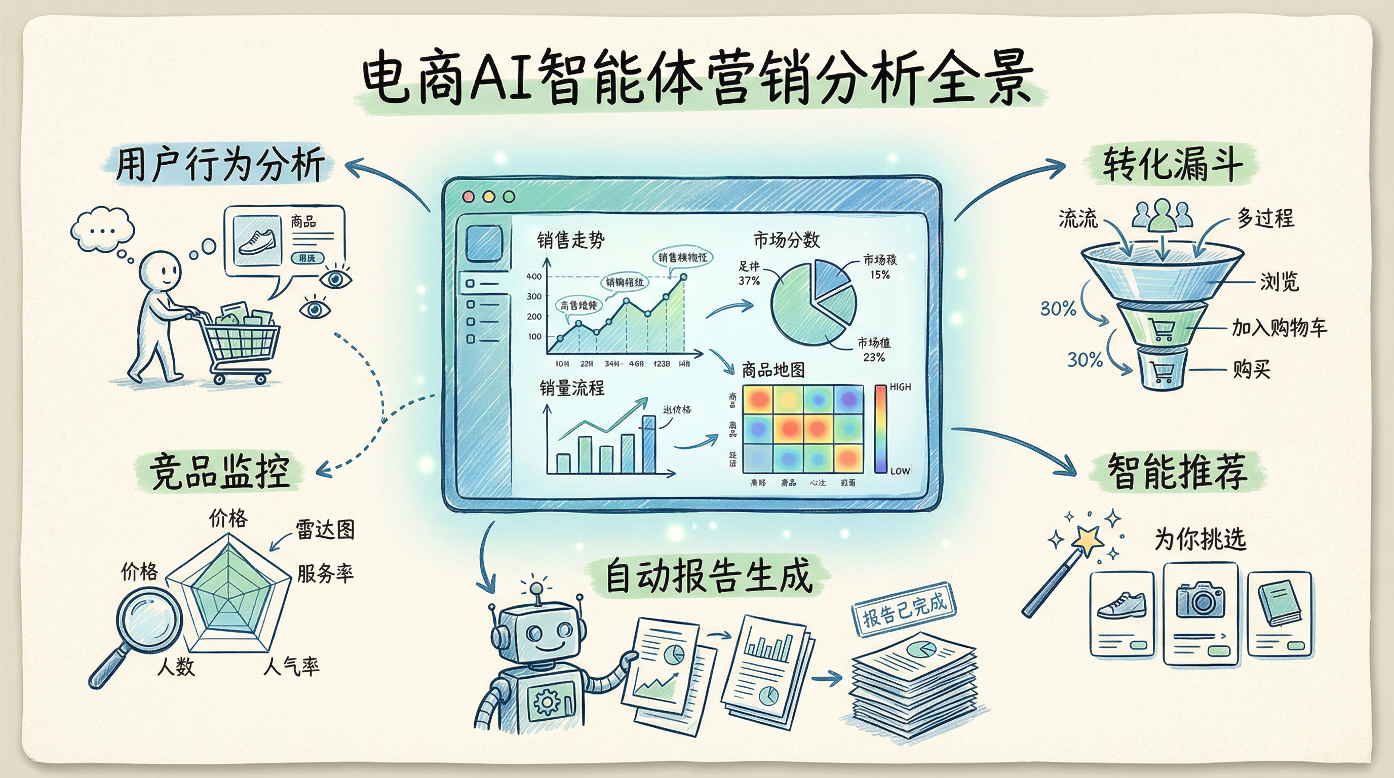 电商运营者几乎每天都面临同一个困境:数据有了,报表也跑了,但真正能指导决策的洞察,却总是慢半拍。促销活动结束了,复盘报告才出来;竞品调价了,自己还蒙在鼓里;流量来了一波,转化率却没人说得清为什么低。这不是因为团队不努力,而是传统营销分析的工作模式,本质上就是"事后诸葛亮"——数据收集、清洗、建模、解读,每一步都需要人工介入,而电商的节奏根本等不起。AI智能体(AI Agent)的出现,正在从根本上改变这个局面。它不仅能自动完成数据采集与分析,还能主动发现异常、生成策略建议,甚至直接执行部分营销动作。本文将系统梳理电商用智能体做营销分析的核心场景、落地路径与实际效果,帮助你把握这一轮效率跃升的窗口期。