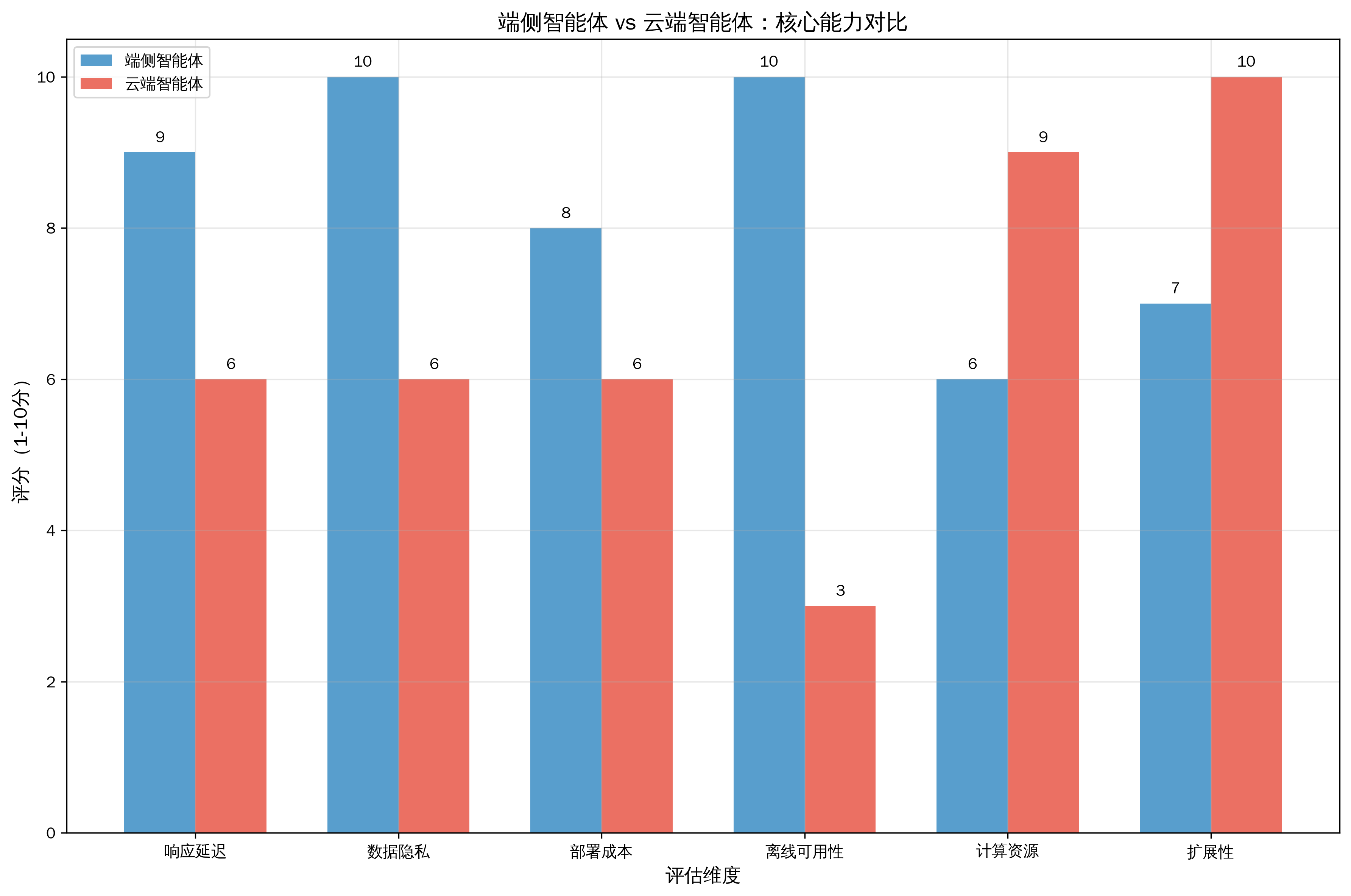 要理解端侧智能体的价值,我们需要从多个维度对比端侧与云端两种部署模式的差异。基于实际应用场景的分析,我们可以从响应延迟、数据隐私、部署成本等六个关键维度进行评估。