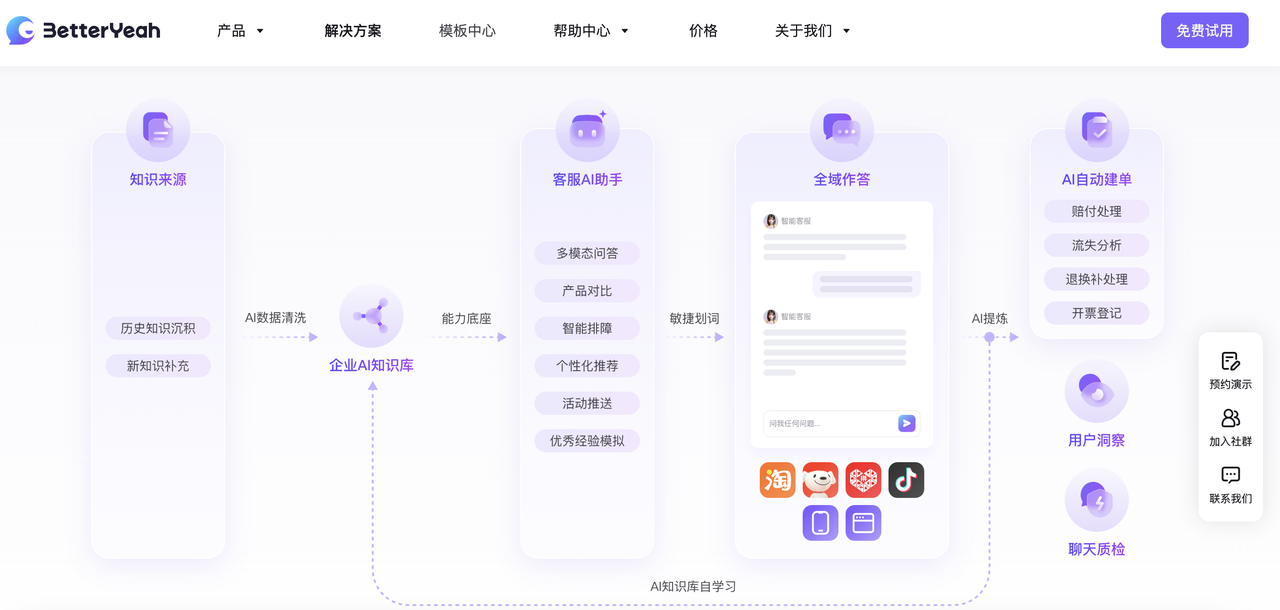 不同行业的智能客服将越来越专业化,具备深度的行业知识和业务理解能力。【BetterYeah AI已经在电商零售、汽车等行业积累了丰富的实践经验,其企业级解决方案能够快速适配不同行业的特定需求,为企业提供从咨询规划到实施落地的全链路支持】。