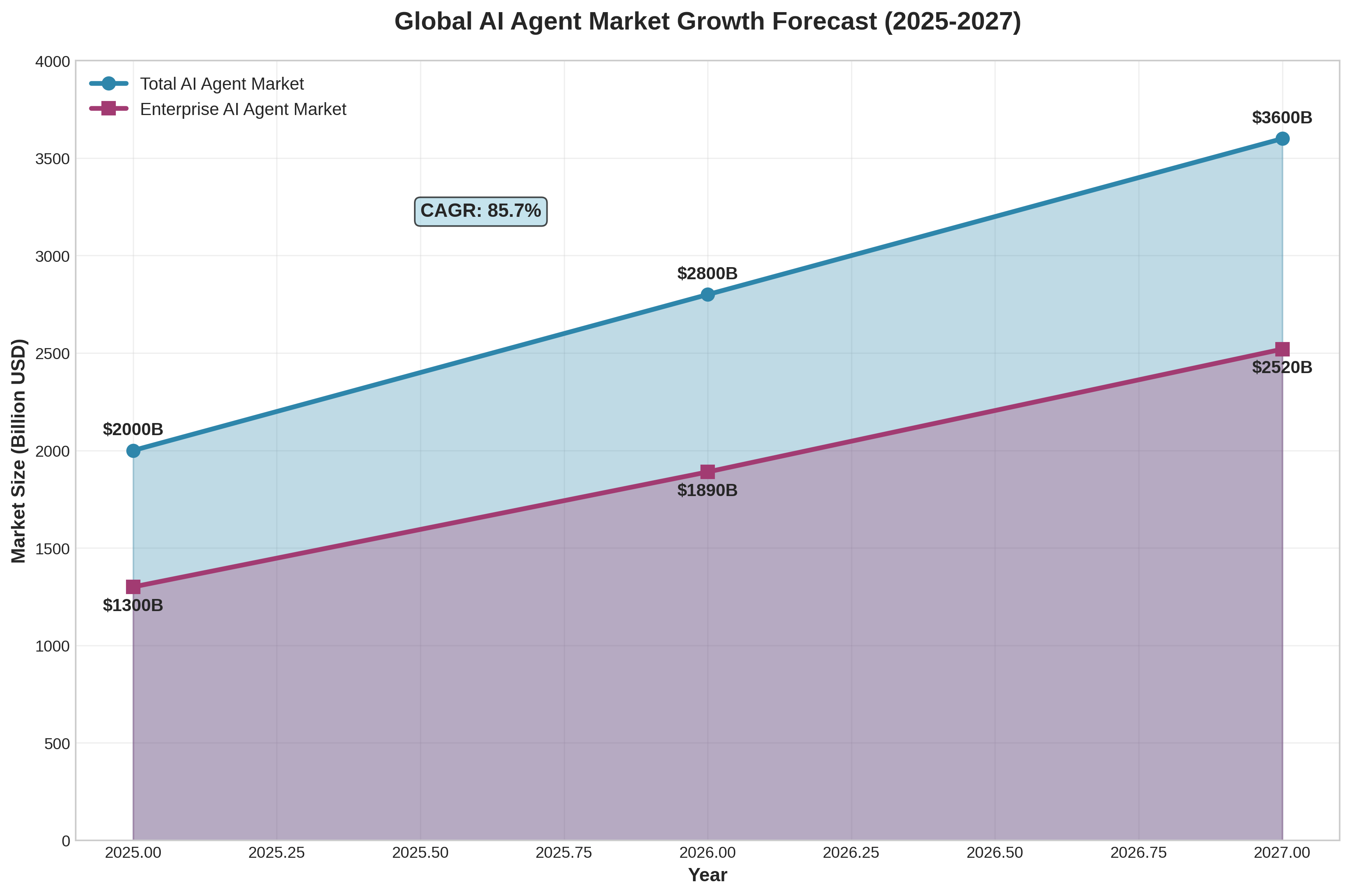 随着人工智能技术的飞速发展,智能体(AI Agent)正在从概念走向商业化应用的关键节点。根据IDC与Gartner的最新预测,2025年全球AI Agent相关市场规模预计突破2000亿美元,其中企业级应用占比超过65%。在Gartner发布的《2025年十大技术趋势》报告中,"Agentic AI"被列为首位,凸显了其在企业数字化转型中的核心地位。