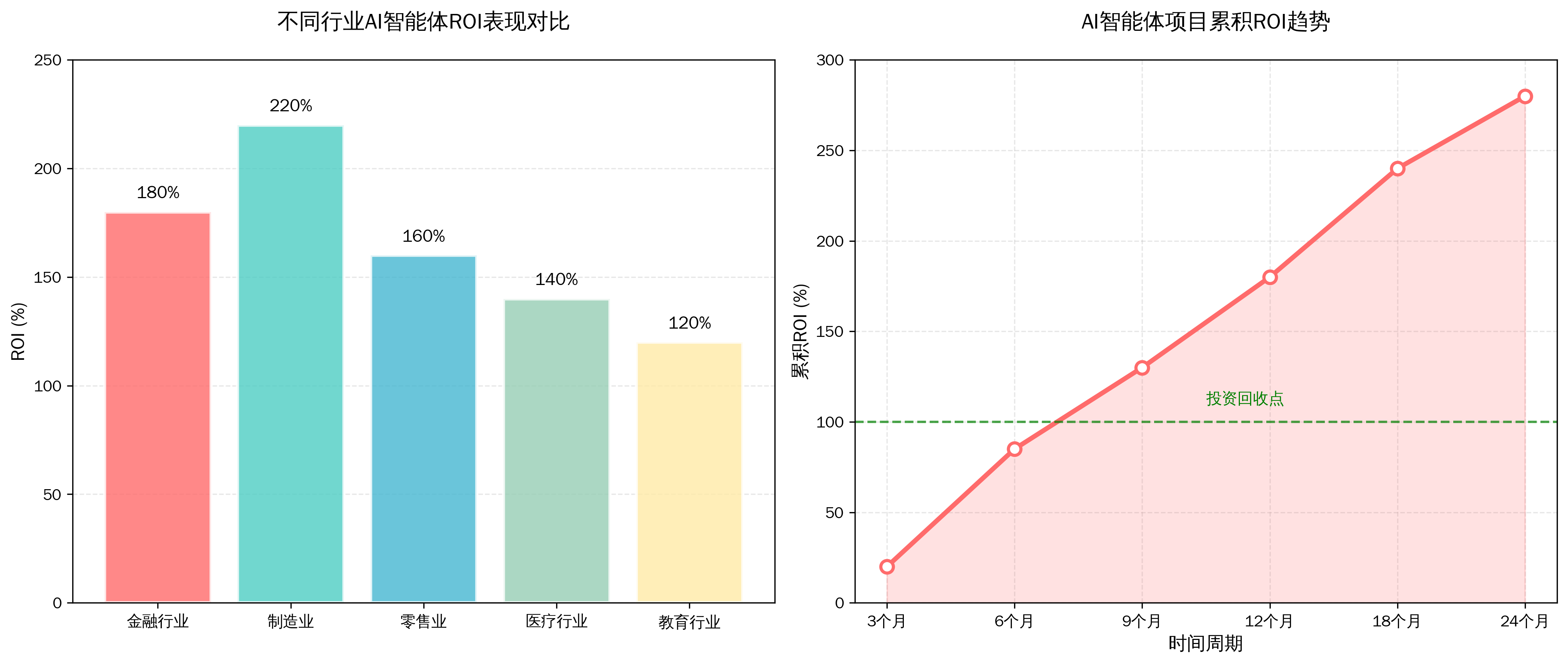 从上图可以看出,制造业在AI智能体应用方面的ROI表现最为突出,这主要得益于生产流程的标准化程度较高,智能体能够快速产生显著的效率提升。而从投资回报周期来看,大多数企业能够在9-12个月内实现投资回收,这为AI智能体项目的商业可行性提供了有力支撑。