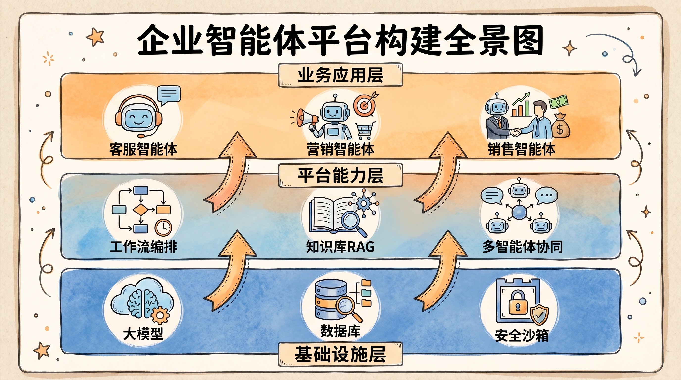 图:企业智能体平台三层架构与多智能体协同全景图