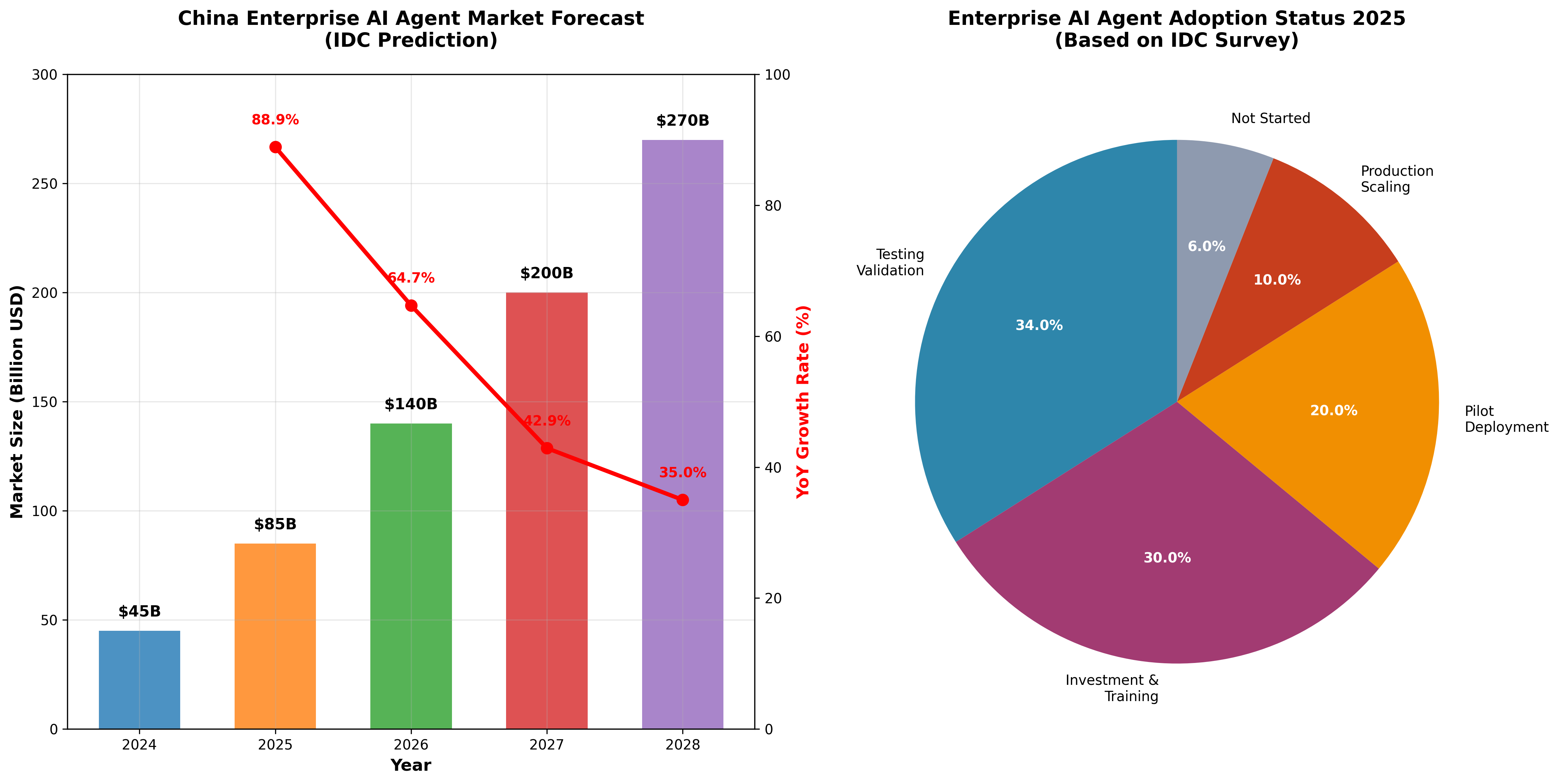 基于IDC权威数据,中国企业级AI智能体市场展现出强劲增长态势。从2024年的45亿美元基准,市场规模将在未来四年内实现跨越式发展,预计2028年达到270亿美元,年复合增长率超过50%。