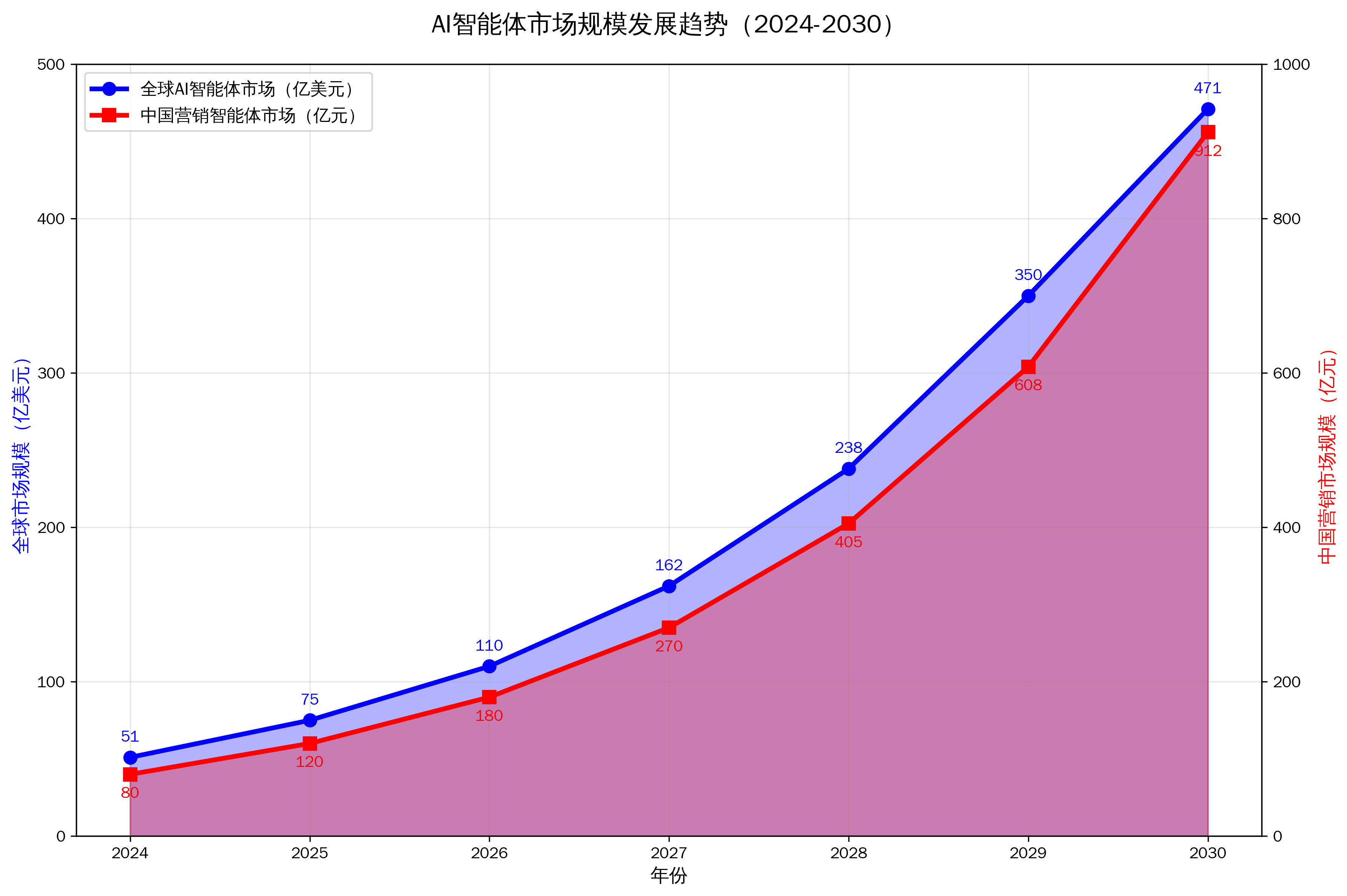 从上图可以清晰看出,无论是全球AI智能体市场还是中国营销智能体细分市场,都呈现出强劲的增长态势。这种增长背后的驱动力来自于企业对自动化、智能化工作流程的刚性需求,以及AI技术成熟度的显著提升。