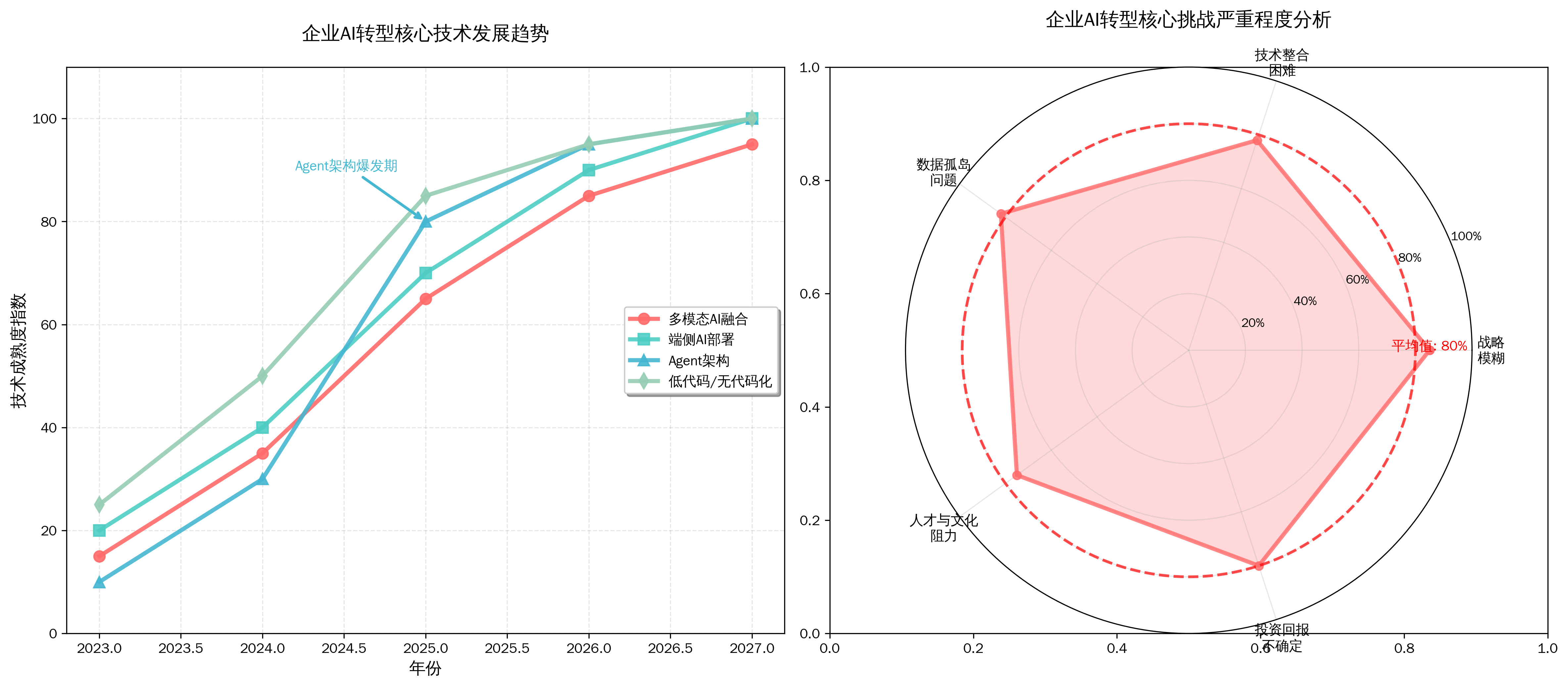 从技术发展趋势可以看出,Agent架构将在2025年迎来爆发期,成为企业AI转型的核心驱动力。右侧的挑战分析显示,战略模糊、数据孤岛、技术整合困难是企业面临的三大主要痛点,平均严重程度达到80%,这也解释了为什么选择合适的AI转型服务产品如此重要。