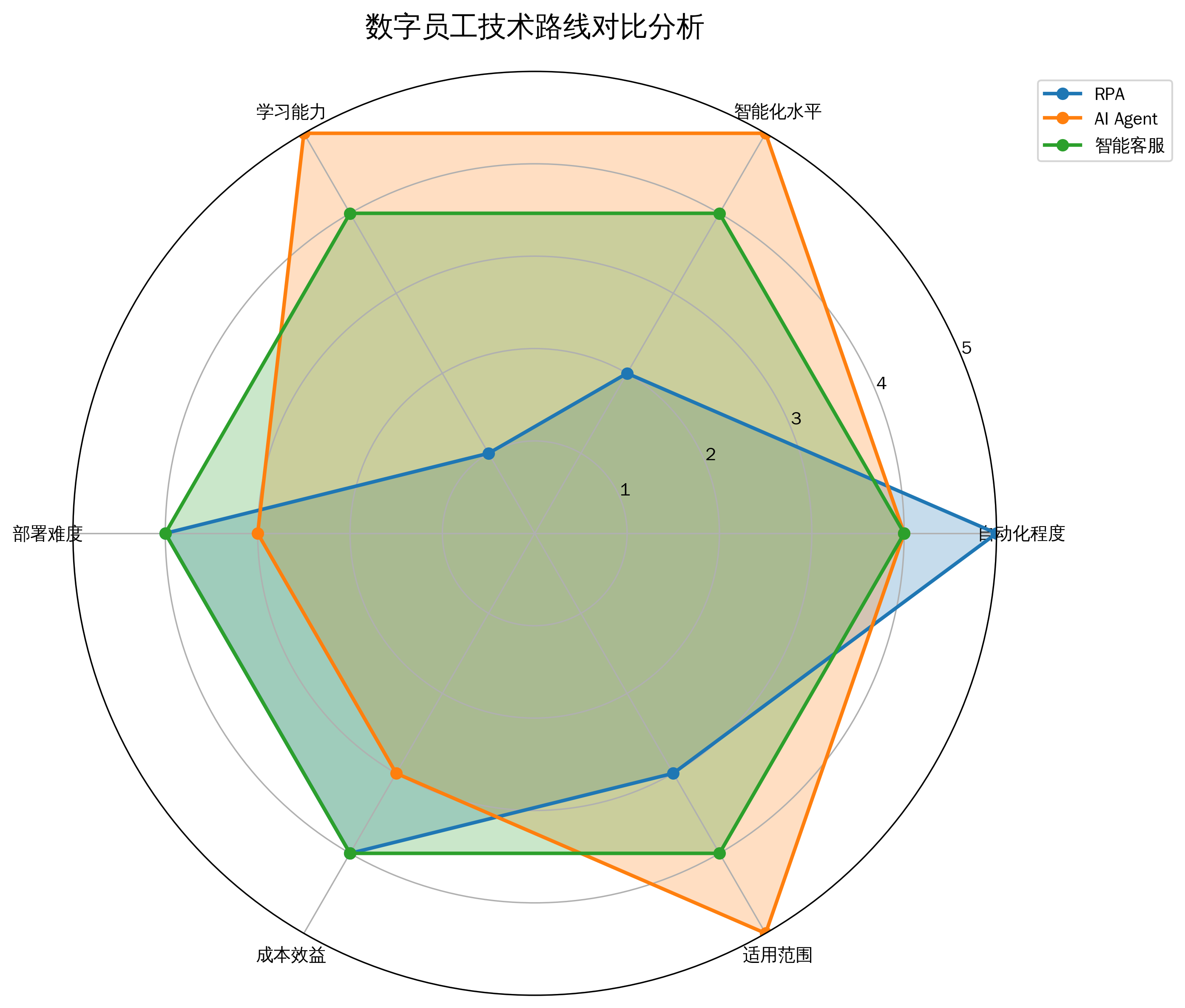 从上图可以看出,三种技术路线各有优势:RPA在自动化程度和成本效益方面表现突出,AI Agent在智能化水平和学习能力方面领先,而智能客服则在各项指标上相对均衡,特别适合对综合能力有要求的应用场景。