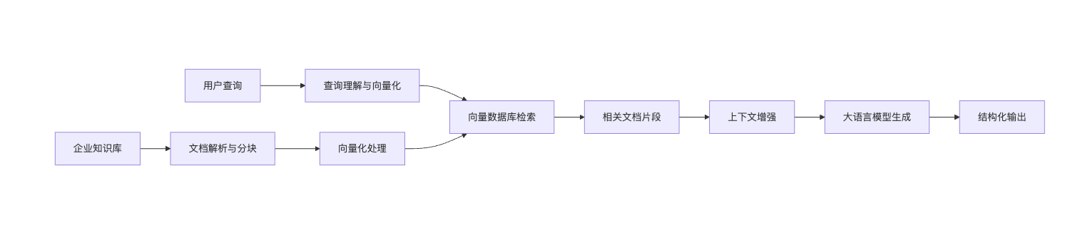 - 知识检索阶段:通过向量相似度计算,从企业知识库中检索与用户查询最相关的信息片段