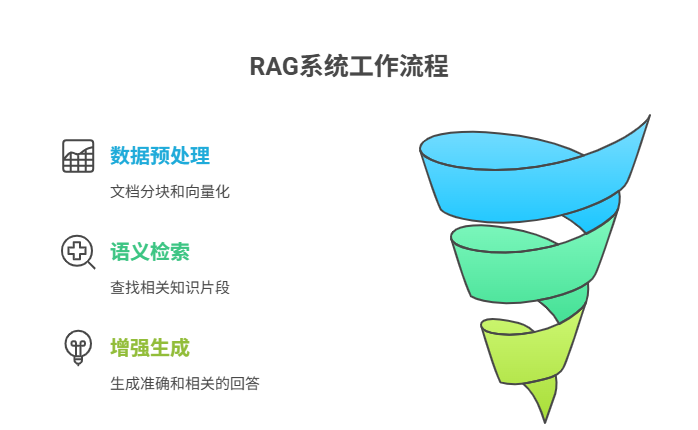 RAG系统的工作流程可以分为三个关键阶段:数据预处理与向量化、语义检索、以及增强生成。