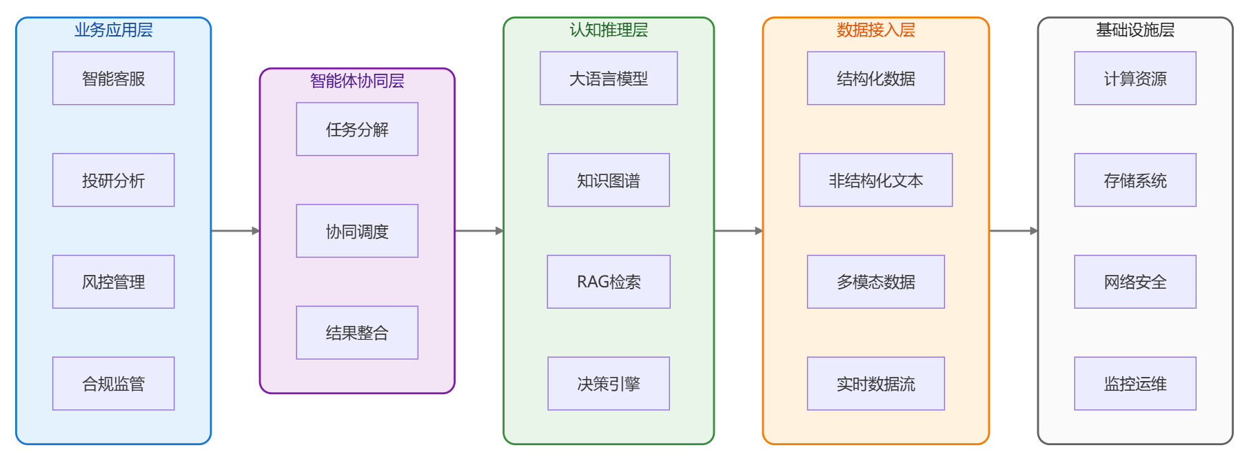现代金融智能体普遍采用多层架构设计,包括感知层、认知层、决策层和执行层。感知层负责多模态数据的接入和预处理,认知层通过大语言模型和知识图谱进行信息理解和推理,决策层基于业务规则和风险模型制定行动方案,执行层则负责与外部系统的交互和任务执行。这种分层架构不仅保证了系统的稳定性和可维护性,还为不同业务场景的定制化需求提供了灵活性。