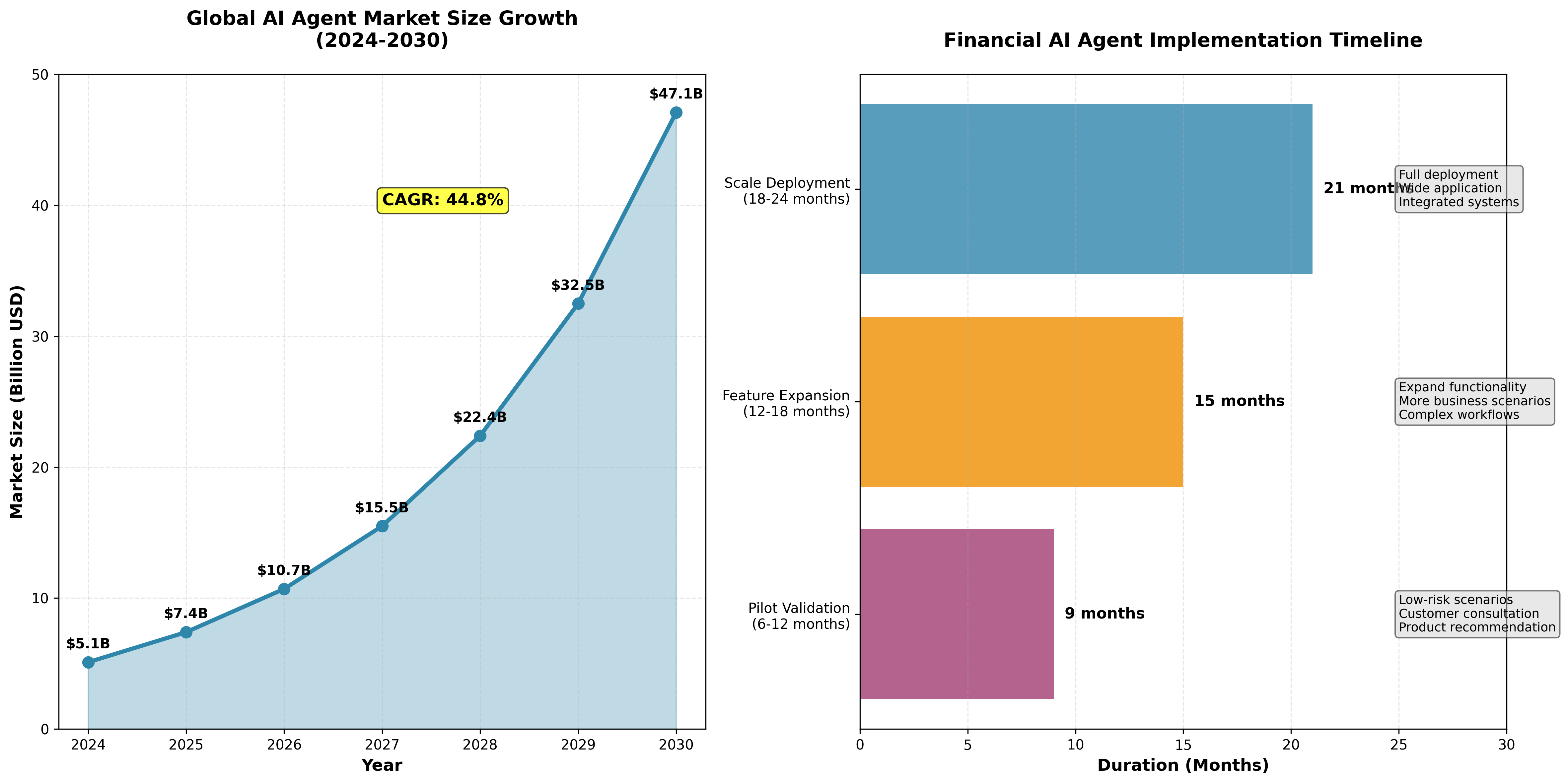 图1:全球AI Agent市场规模增长趋势与金融AI Agent实施时间线