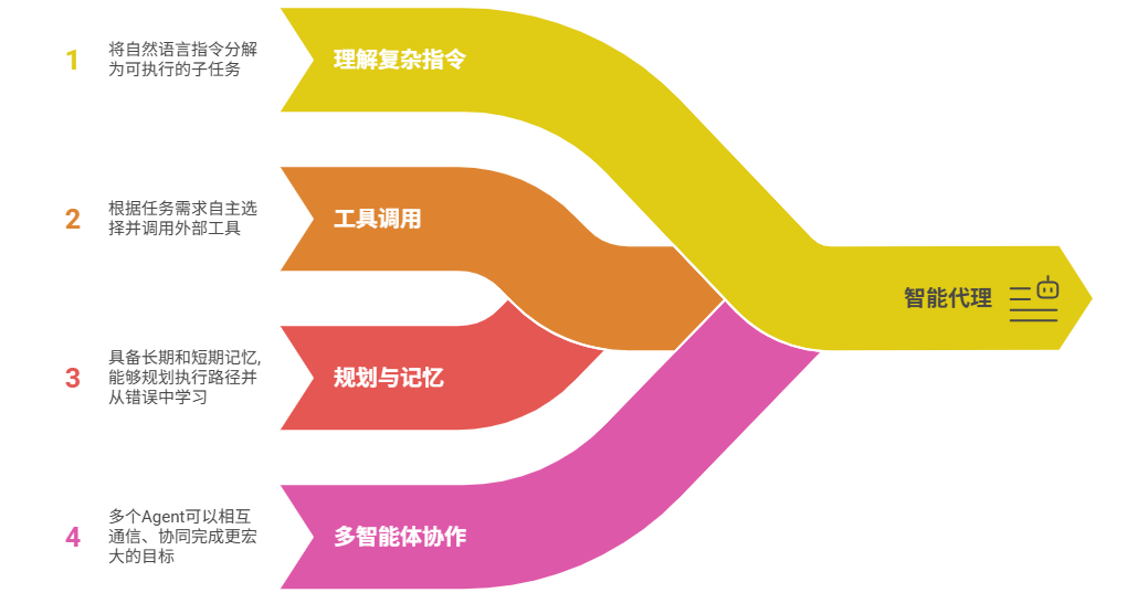 - 工具调用(Tool Calling):根据任务需求,自主选择并调用外部工具(如数据库、API、代码执行器)。