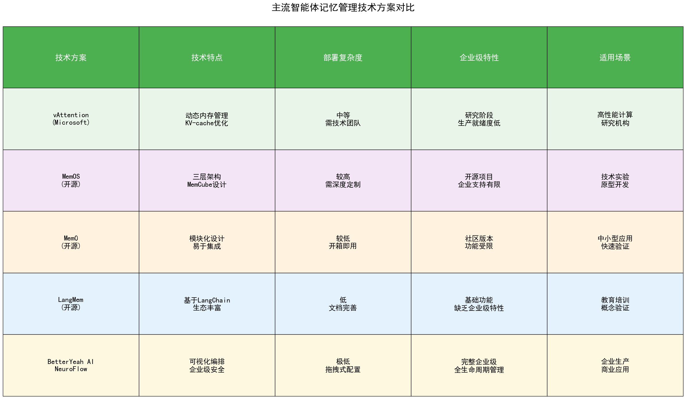 当前市场上存在多种智能体记忆管理技术方案,每种方案都有其独特的技术特点和应用场景。通过深入分析这些方案的优劣势,企业可以根据自身需求选择最适合的技术路径。
