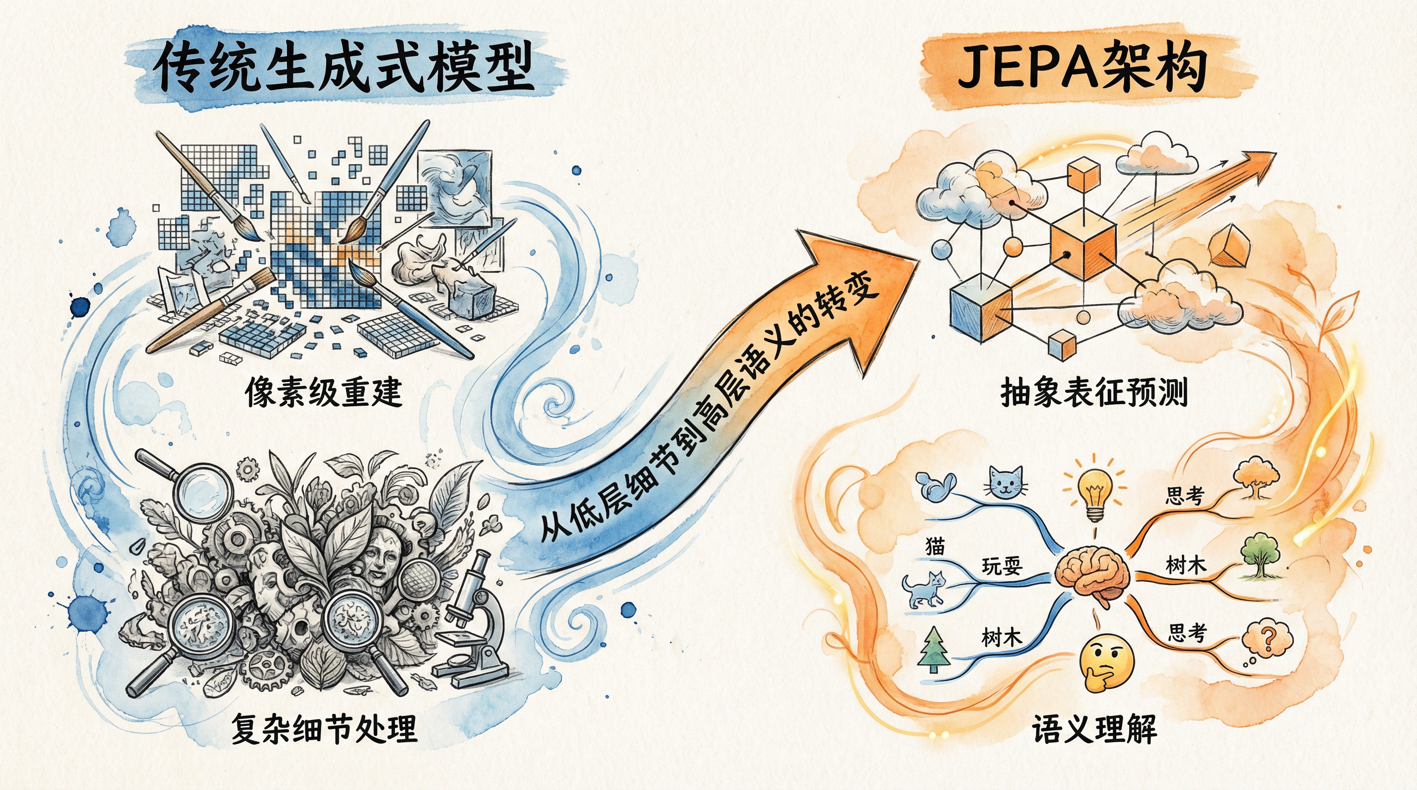 传统的生成式模型试图在像素级别重建图像或在词汇级别生成文本,这种方法虽然能产生逼真的输出,但存在致命缺陷:模型必须花费大量计算资源去建模那些难以预测且与任务无关的低层细节,比如图像中的噪声、纹理变化,或文本中的语法细节。JEPA通过将预测任务转移到抽象的表征空间,使模型能够专注于捕捉数据中可预测的、具有语义意义的规律。