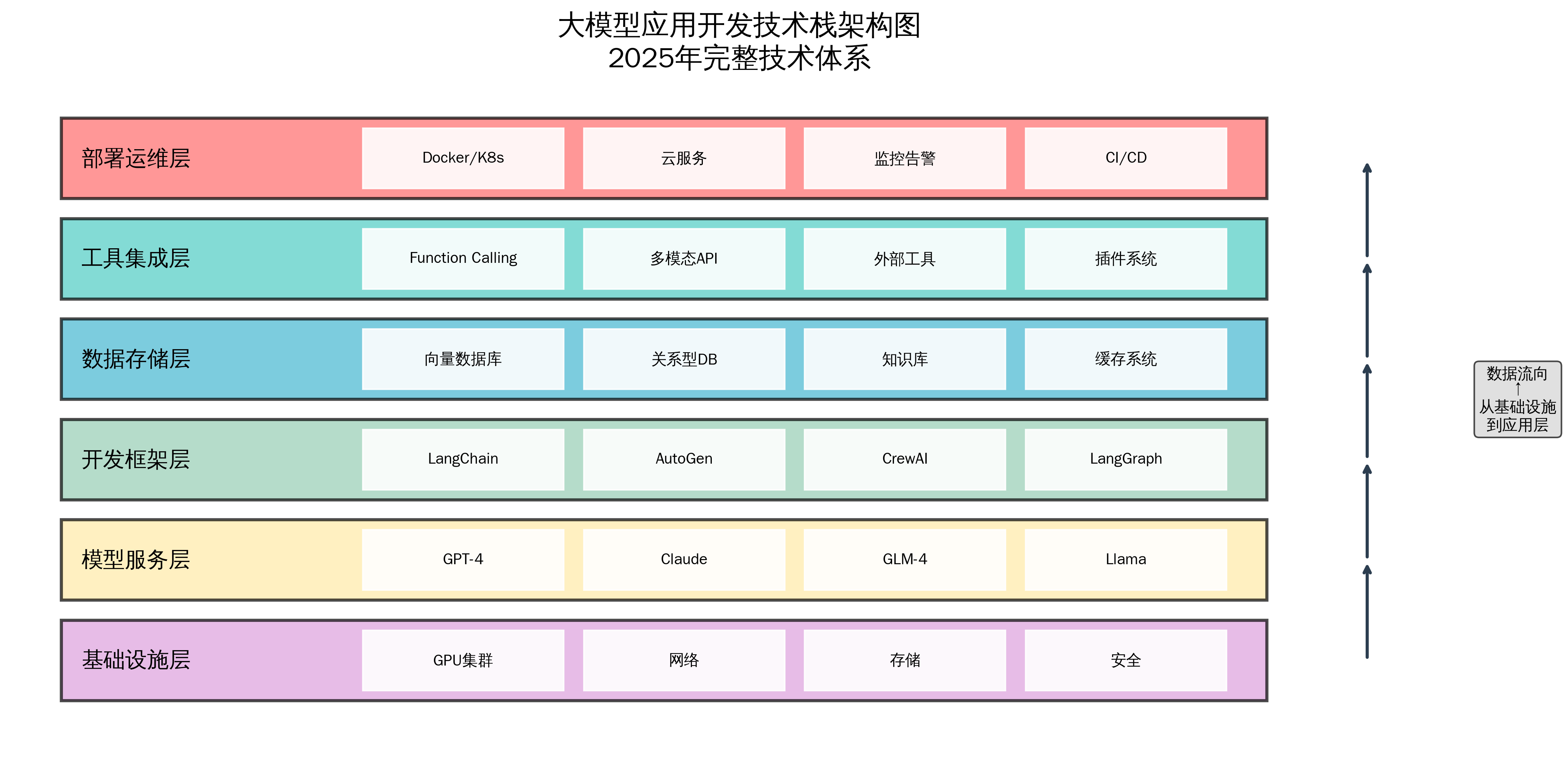 现代大模型应用开发需要掌握的技术栈可以分为六个核心层次,每个层次都承担着不可替代的功能: