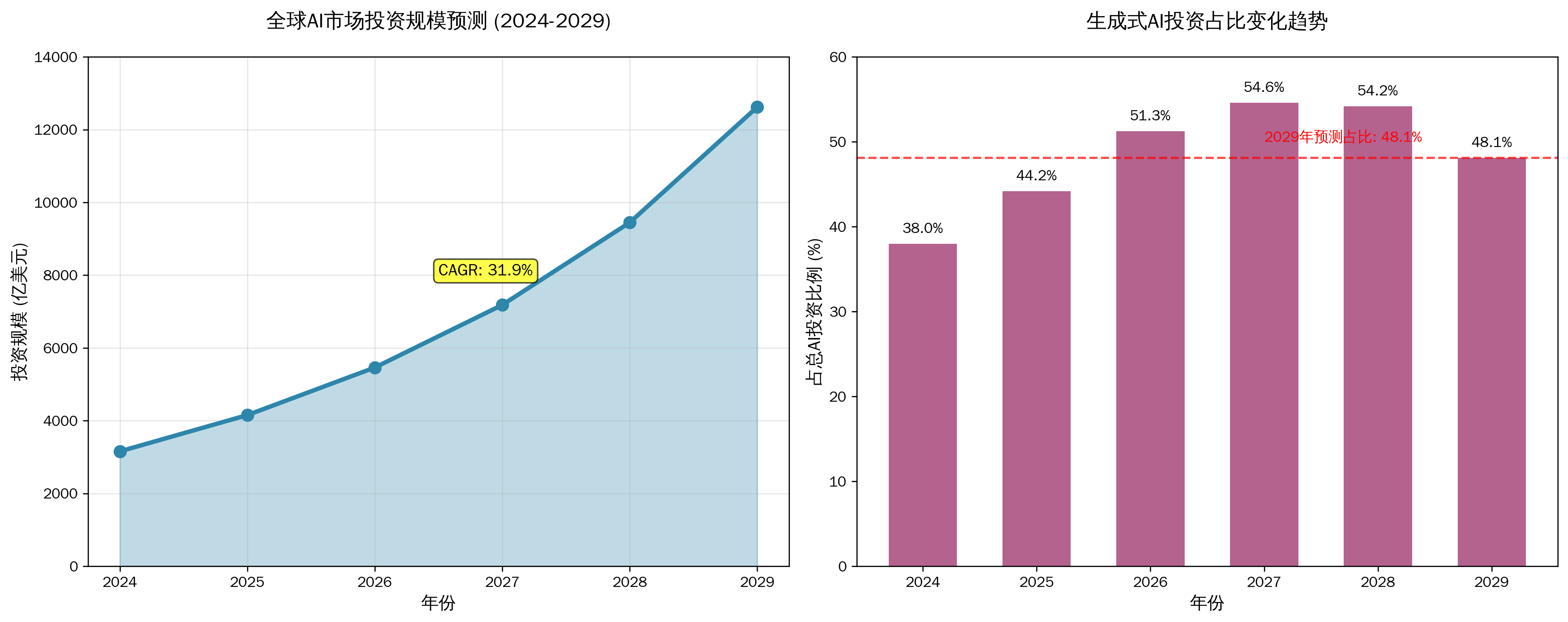 从上图可以看出,全球AI市场投资规模将从2024年的3,159亿美元增长到2029年的12,619亿美元,五年复合增长率高达31.9%。更值得关注的是,生成式AI在整体AI投资中的占比持续上升,预计到2029年将达到48.1%,成为AI投资的最大细分领域。