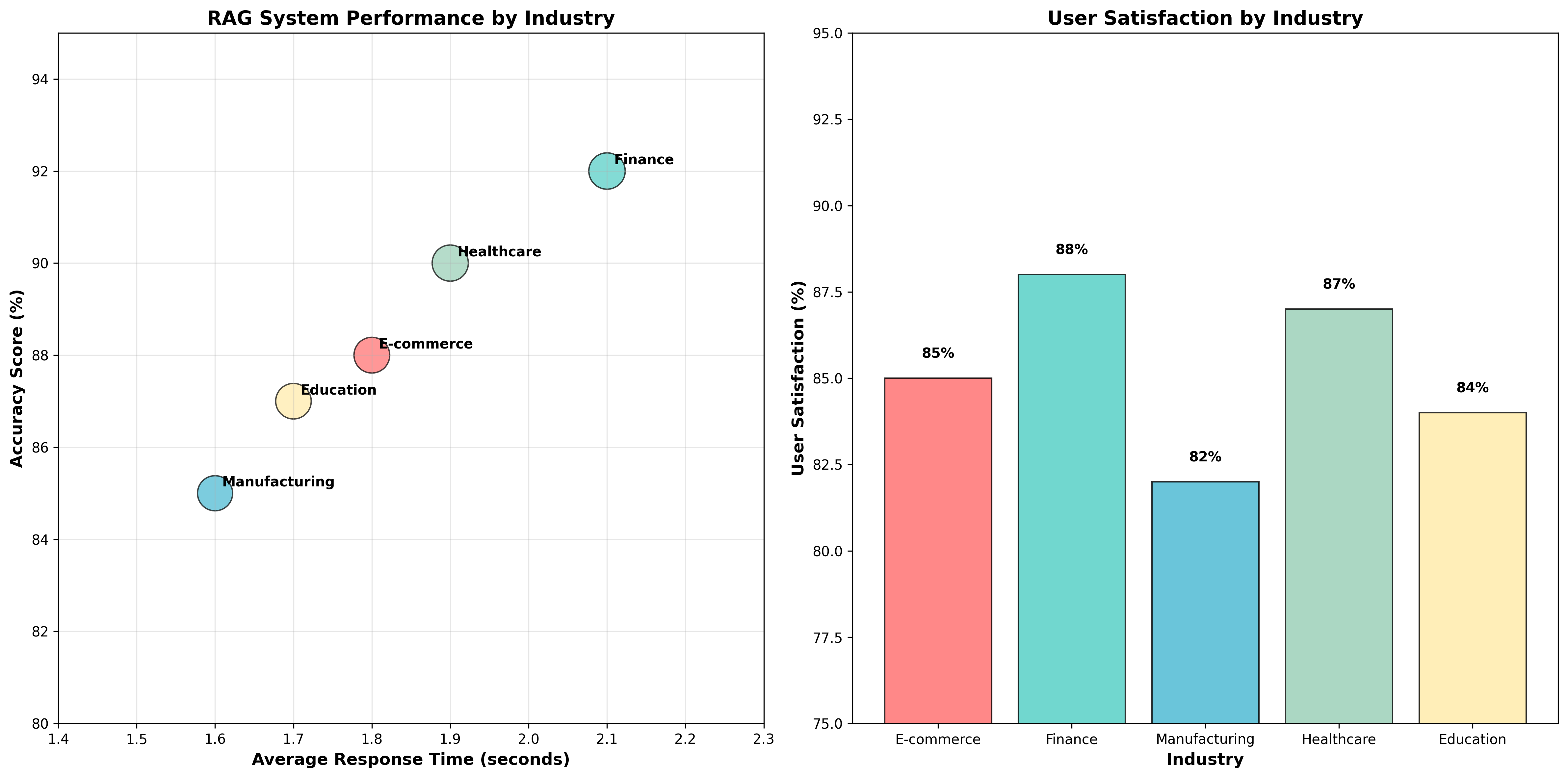 从上图可以看出,不同行业在RAG系统性能表现上存在明显差异。金融行业在准确性方面表现最佳,达到92%,这主要得益于其严格的数据质量控制和专业化的知识体系。电商行业在用户满意度方面领先,达到85%,体现了其在用户体验优化方面的深度投入。制造业则在响应时间上表现突出,平均响应时间仅为1.6秒,满足了生产环境对实时性的严格要求。