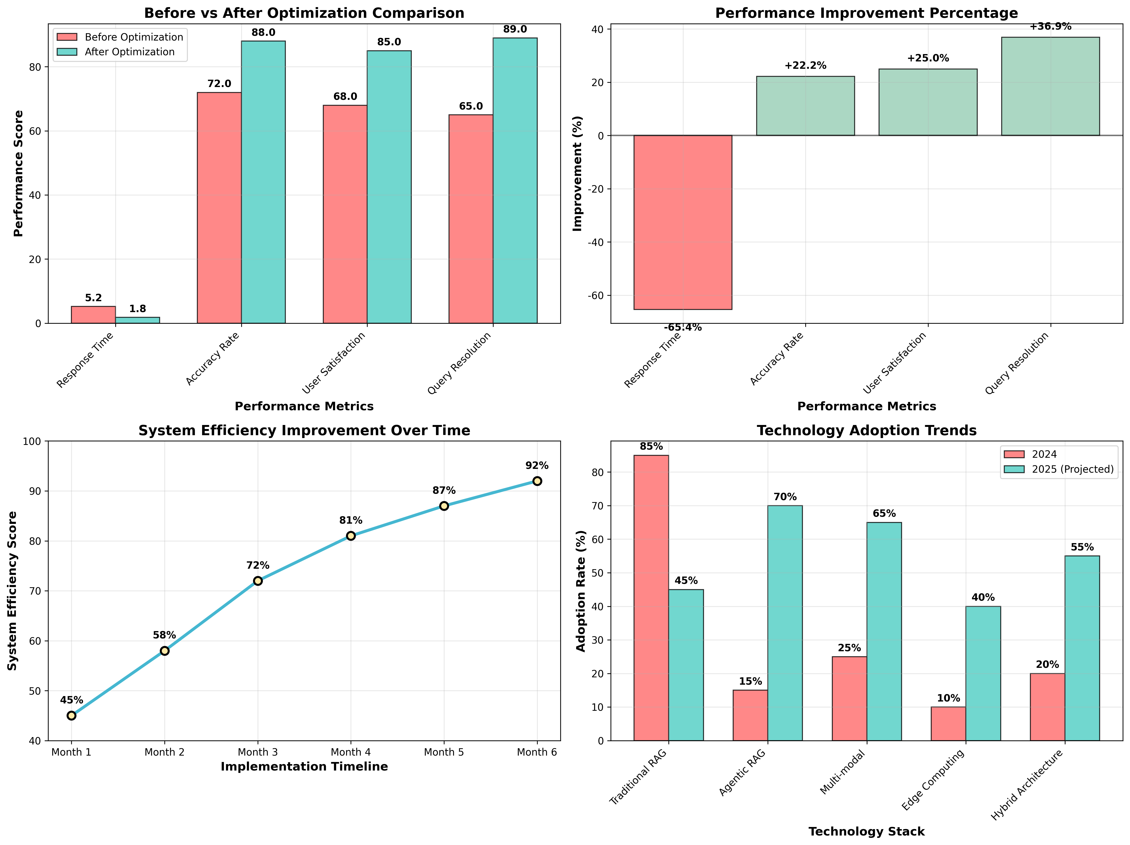 从优化效果分析图可以看出,系统优化在多个维度都取得了显著成效。响应时间从5.2秒缩短到1.8秒,改善幅度达到65%;准确率从72%提升到88%,提升了22%;用户满意度从68%增长到85%,增幅为25%;查询解决率从65%跃升到89%,改善了37%。这些数据充分证明了系统优化的有效性。