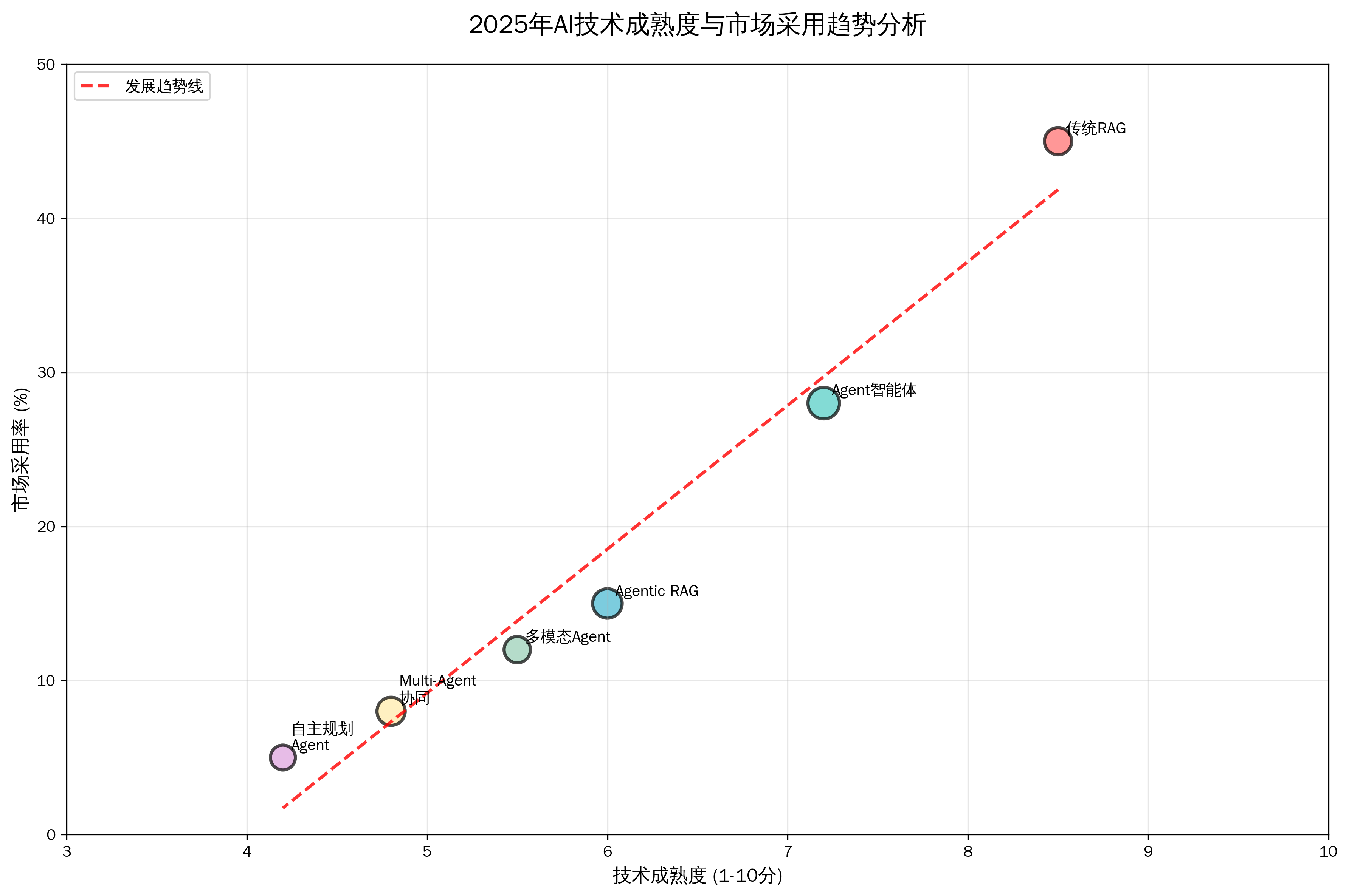 从上图可以看出,传统RAG技术已经进入相对成熟的阶段,市场采用率达到45%,主要应用于知识问答、文档检索等相对简单的场景。Agent智能体虽然技术成熟度略低,但市场采用率已达到28%,显示出强劲的发展势头。