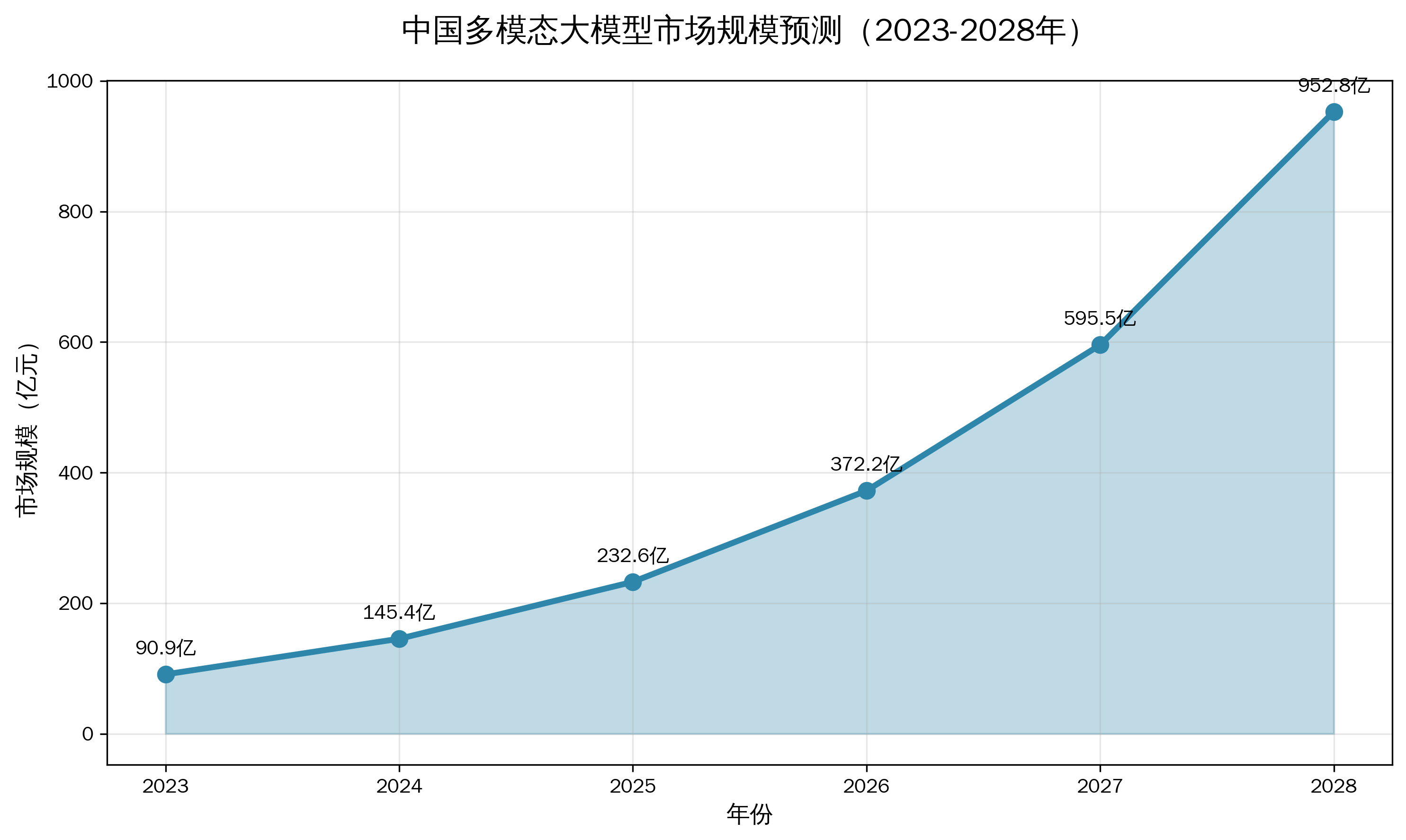 根据搜狐多模态大模型市场分析报告数据显示,2023年中国多模态大模型市场规模已达90.9亿元,预计2024年将增长至145.4亿元,到2028年有望突破950亿元大关,复合年增长率保持在60%以上的高速增长水平。