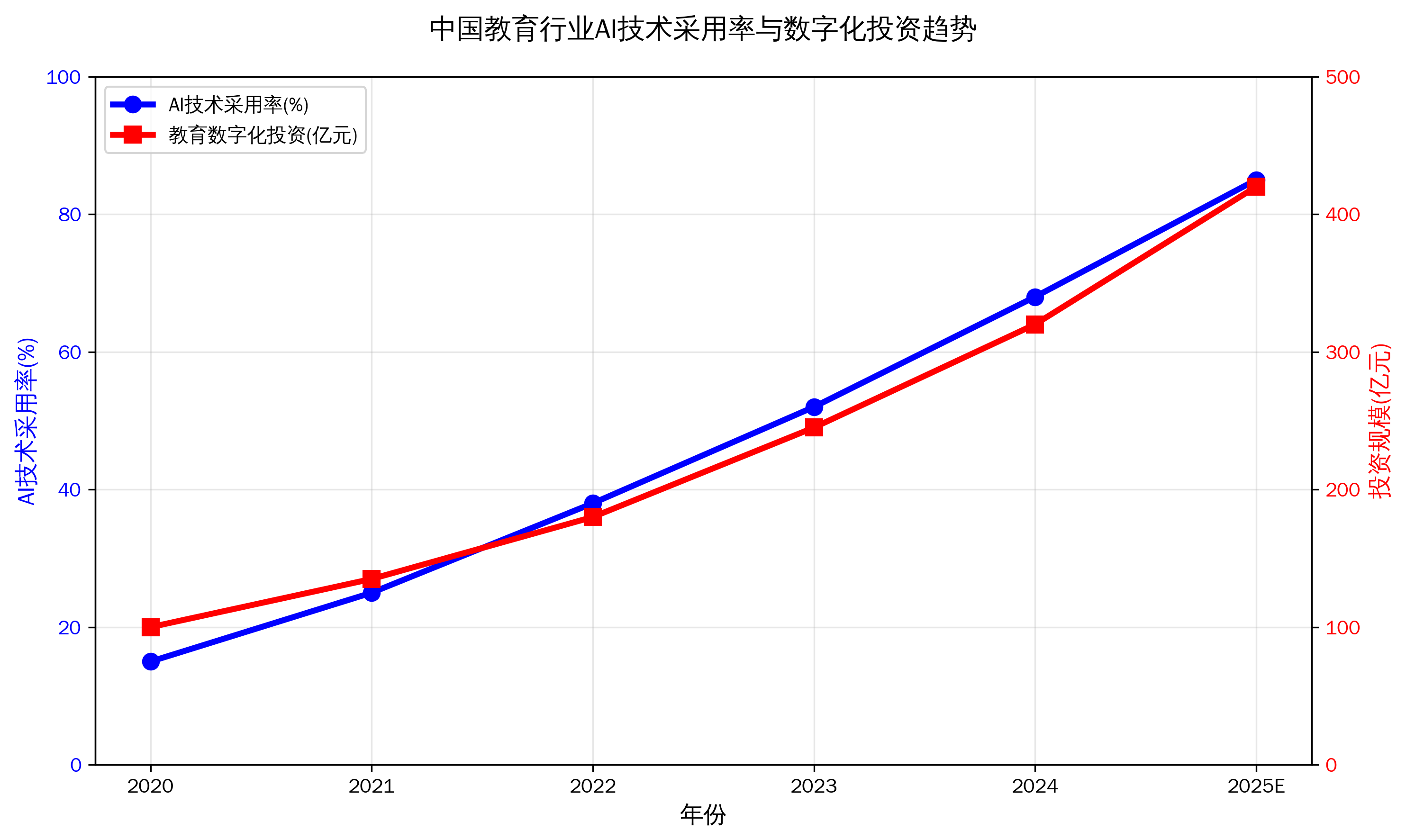 从数据趋势可以看出,教育数字化投资规模与AI技术采用率呈现强相关性,预计2025年相关投资将达到420亿元规模。这为学校级AI建设提供了充足的市场支撑和政策保障。