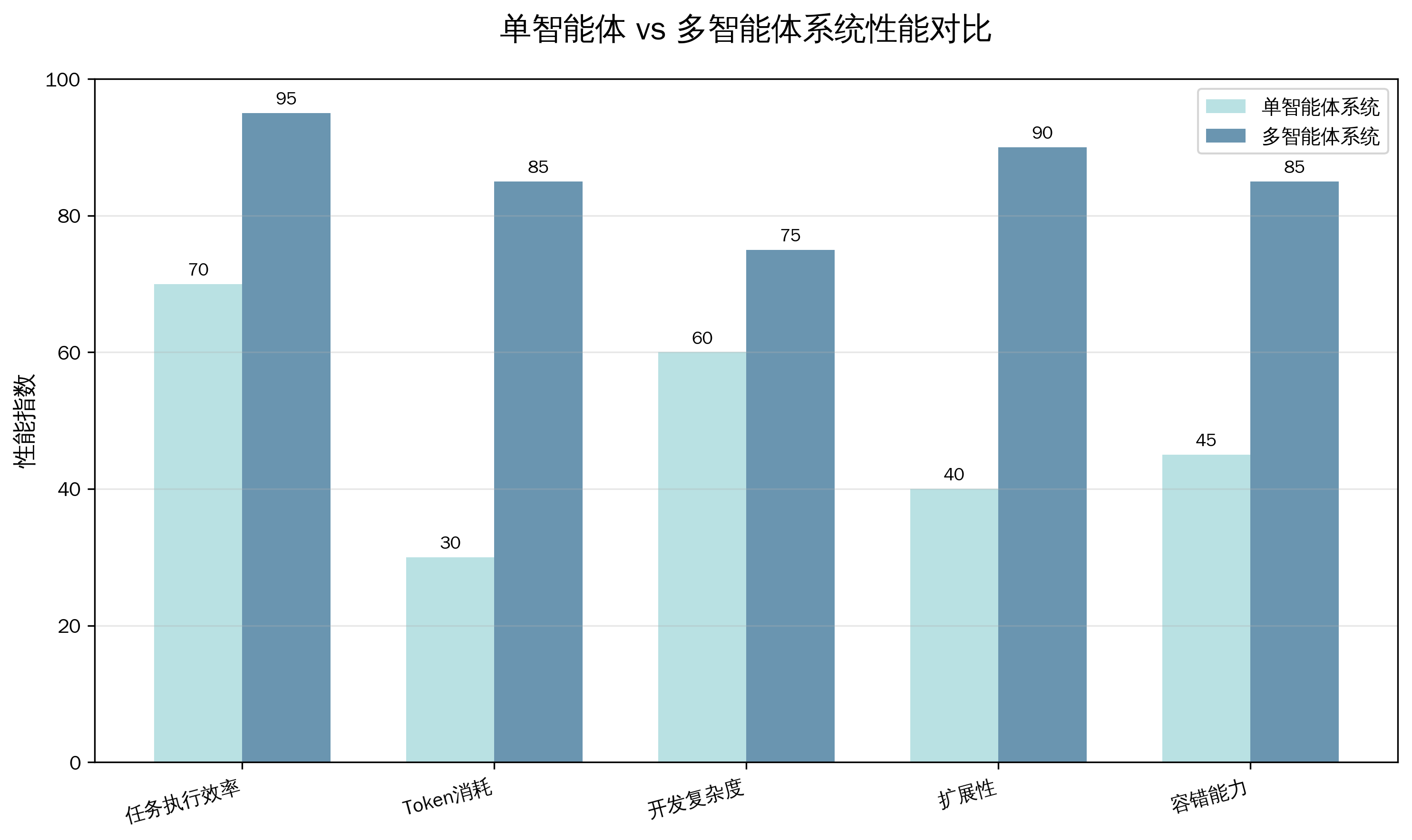 从系统架构复杂度来看,单智能体系统明显更加简洁。它只需要维护一个智能体实例,系统部署、监控和调试都相对简单。这种简洁性使得单智能体系统在快速原型验证和小规模应用中具有明显优势。