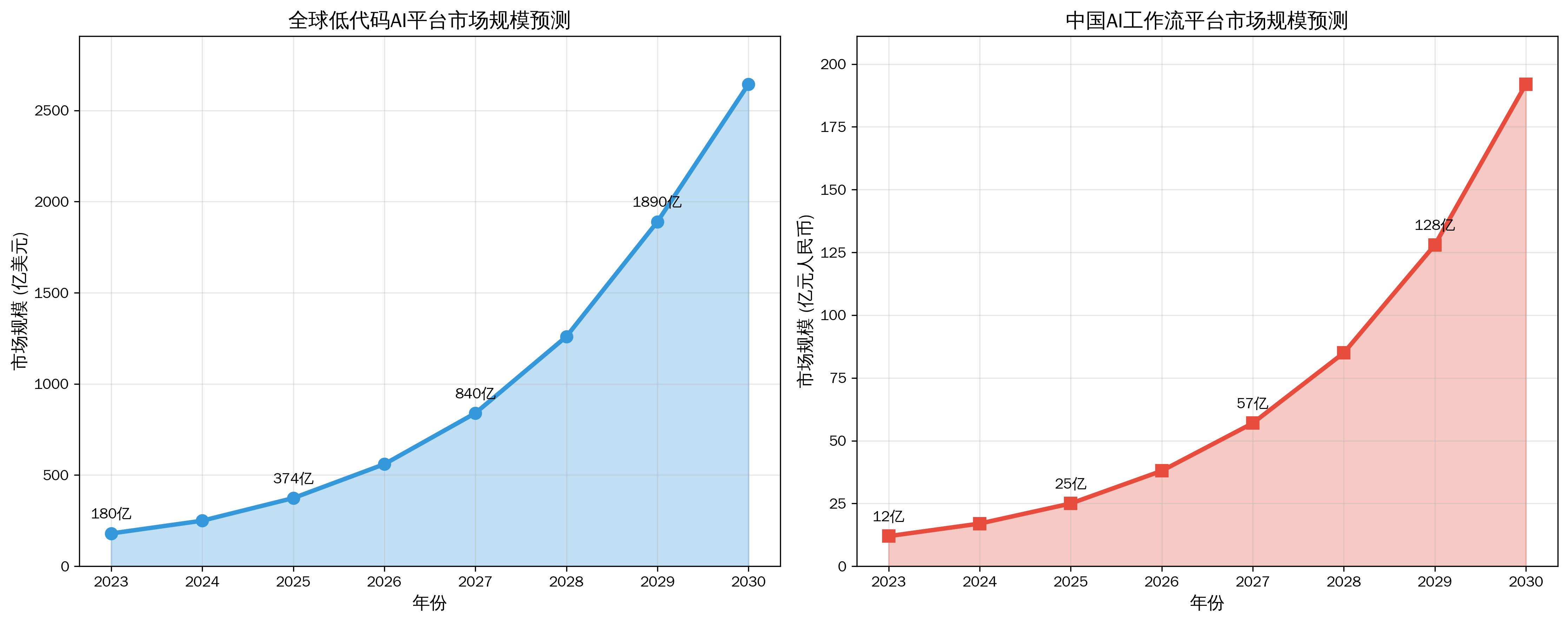 当企业数字化转型进入深水区,AI工作流自动化已从"可选项"升级为"必选项"。根据Fortune Business Insights最新报告,全球低代码开发平台市场规模预计将从2025年的373.9亿美元增长到2032年的26440亿美元,年复合增长率高达32.2%。在这一轮技术浪潮中,可视化AI工作流构建平台正成为企业提升运营效率、降低开发门槛的关键武器。
