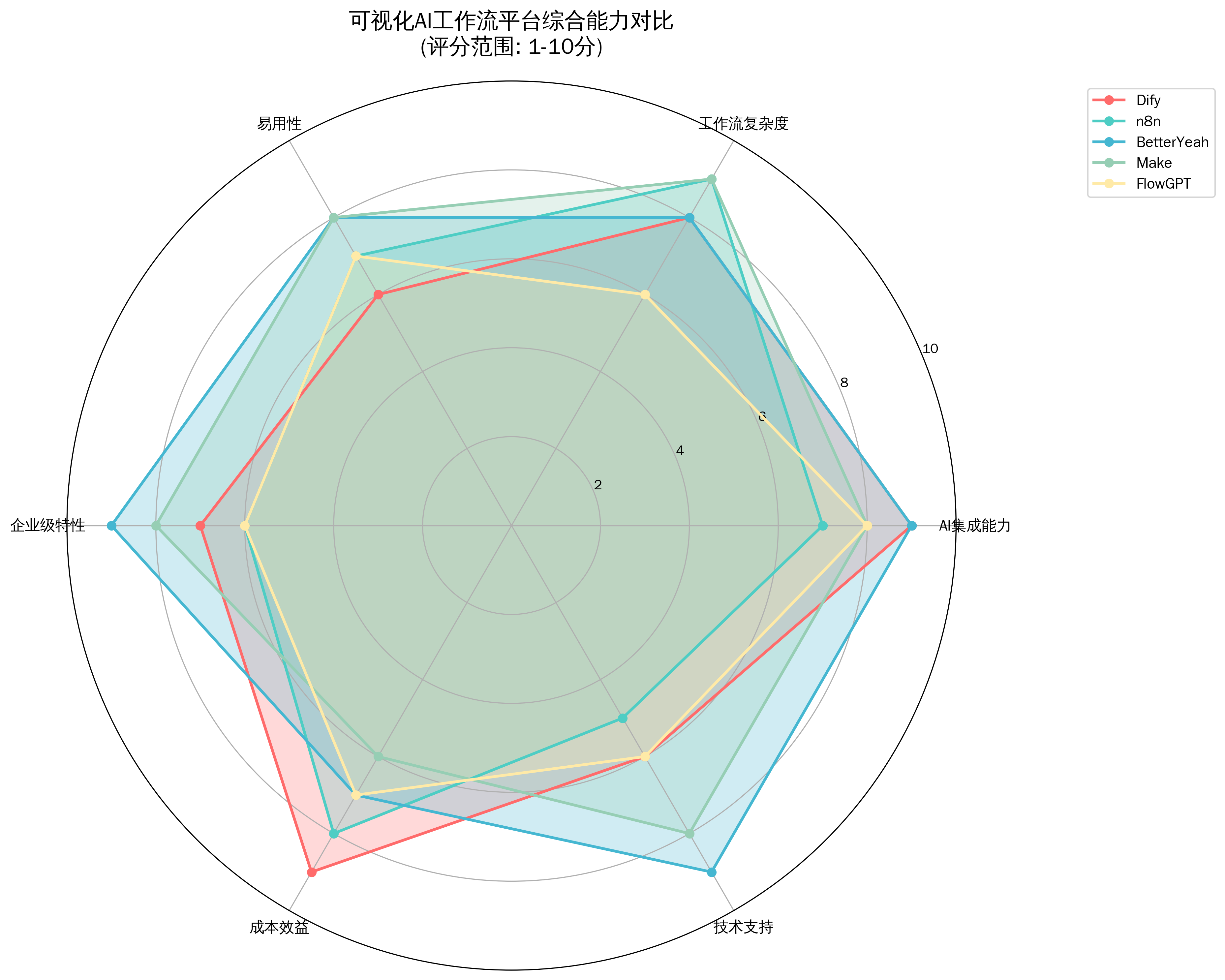 为了更直观地展示各平台的能力差异,我们构建了多维度评估模型,从AI集成能力、工作流复杂度、易用性、企业级特性、成本效益和技术支持六个维度进行量化对比。