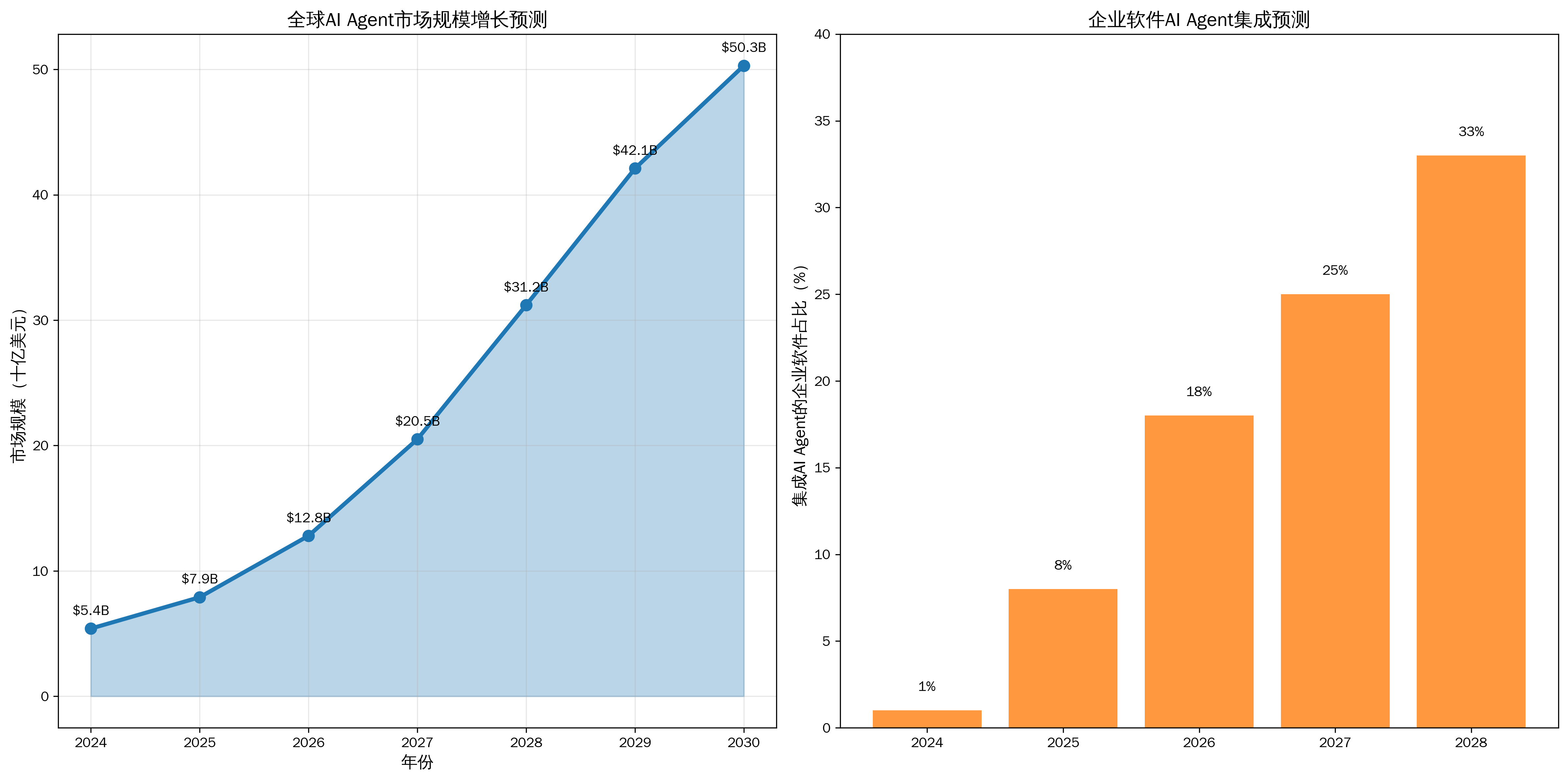 权威研究机构的数据显示,AI Agent市场正在经历前所未有的增长。根据多家机构的一致预测,全球AI Agent市场规模将从2024年的54亿美元快速增长至2030年的503亿美元,复合年增长率超过45%。这一增长速度远超大多数科技领域,反映了企业对智能自动化解决方案的迫切需求。